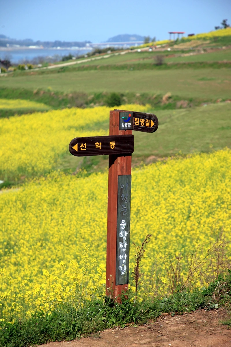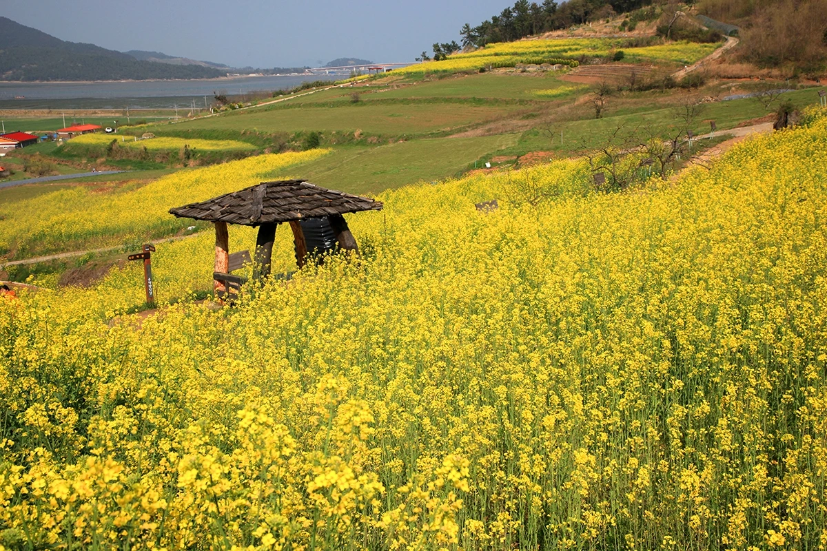 이청준 선생은 단편소설 ‘선학동 나그네’에서 선학동을 이렇게 설명한다. “포구에 물이 차오르면 관음봉은 한 마리 학으로 물위를 떠돌았다. 선학동은 날아오르는 학의 품 안에 안겨진 마을인 셈이다. 동네 이름이 선학동이라 불리게 된 연유다.” 학이 날개를 펼친 듯한 관음봉 아래 자리한 마을은 아늑하다. 득량만 바다를 향해 층층이 다랑논이 어우러진 풍경은 봄이 압권이다. 논과 밭은 노란 유채꽃으로 뒤덮이고, 유채꽃밭 아래로 득량만 바다가 푸른 배경을 드리운다. 유채꽃밭 가운데 작은 정자가 운치를 더한다. 전국 사진작가들 사이에도 이름난 풍경이다. 노란 유채꽃과 쪽빛 바다는 셔터를 누르기만 하면 작품이 된다. 임권택 감독의 영화 <천년학> 촬영지로도 유명한데 원작이 ‘선학동 나그네’다. 마을 제방에는 영화 세트장이 그대로 남아 있다. 가을이면 하얀 메밀밭으로 변신해 눈이 내린 듯한 하얀 메밀꽃 풍경이 바다와 그림처럼 어우러진다. 매년 10월이면 메밀꽃축제도 열린다.