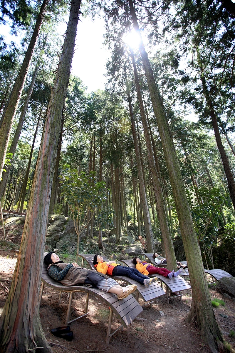 장흥은 서울 광화문에서 정남향을 직선으로 연결하면 닿는 정남진이다. 이곳 장흥이 웰니스 여행지로 첫손에 꼽는 이유는 세상에서 지친 마음도 쉬어갈 수 있는 편백숲이 있어서다. 억불산 자락에 자리한 ‘정남진편백숲우드랜드’는 100㏊에 이르는 편백숲을 자랑한다. 수령 50년이 넘는 아름드리 편백이 군락을 이루고 있다. 숲으로 들어서면 하늘을 찌를 듯 곧게 치솟은 편백이 빼곡하다. 편백 사이로 웰빙산책로, 편백톱밥산책로, 사랑의 오솔길 등 아름다운 산책로가 많다. 편백톱밥산책로는 맨발로 걸으면서 머리부터 발끝까지 편백을 느끼게 된다. 편백의 허리쯤에서 지그재그로 이어지는 하늘데크는 우드랜드에서도 손꼽히는 명소다. 데크길이 끝나고 사색의 숲으로 들어서면 짙은 편백 향이 반긴다. 사색의 숲 안에는 몸을 누일 수 있는 나무침대와 해먹이 설치되어 있다. 편백숲의 효능을 좀 더 세심하게 느끼려면 산림치유 프로그램에 참여해보자. 짚신을 신고 짝꿍과 서로 번갈아가며 눈을 감고 숲길을 걷다 보면 바람소리, 새소리까지 더 크게 다가온다. 황토흙집, 나무집, 한옥 등 다양한 숙박시설을 갖추었는데, 어느 집이든 편백숲에 둘러싸였다. 편백은 일반 수목에 비해 피톤치드와 음이온을 5배 이상 내뿜는다. 이곳의 숙박시설이 인기 많은 이유다.