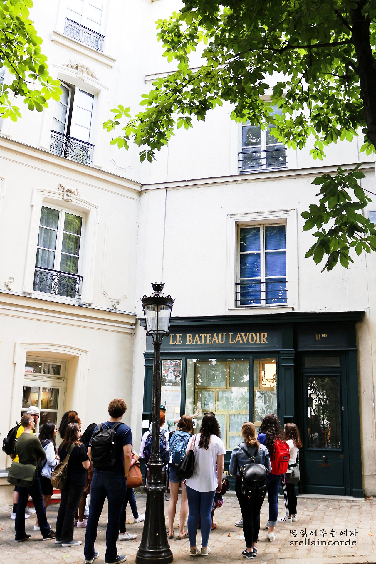 20세기 초 파리로 몰려든 예술가들은 파리의 도심에서 벗어난 북부 몽마르뜨에 자리를 잡았다. 피카소가 살았던 아뜰리에 건물은 피아노 공장을 개조한 것으로 계단은 삐꺽거리고 금방이라도 쓰러질 듯 낡았는데, 방이 30개였지만 수도꼭지는 단 하나였고 가스도 전기도 들어오지 않았단다. 그와 한 방에 살았던 프랑스 시인 막스 자콥의 표현에 따르면 볼품없기가 ‘세탁부들의 빨래터로 쓰이는 강변에 늘어선 낡은 배들’ 같은 바토 라부아르(bateau-lavoir : 세탁선)다. 1970년 화재로 소실됐다가 재건된 건물은 짙은 녹색의 현관 전경에 피카소의 유명한 작품들이 걸려있고, 피카소의 세탁선 안내판이 붙어있다.