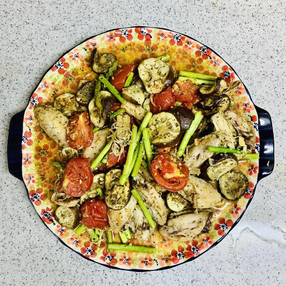 덕분에 요즘 거의 매일 요리를 한다. 토마토와 아스파라거스 같은 채소를 듬뿍 넣고 계란이나 조개관자 닭고기 등 메인을 바꾸어 오븐에 굽거나 프라이팬에 볶는다. 양념은 소금과 후추, 바질, 마늘 그리고 올리브 오일을 곁들인다.