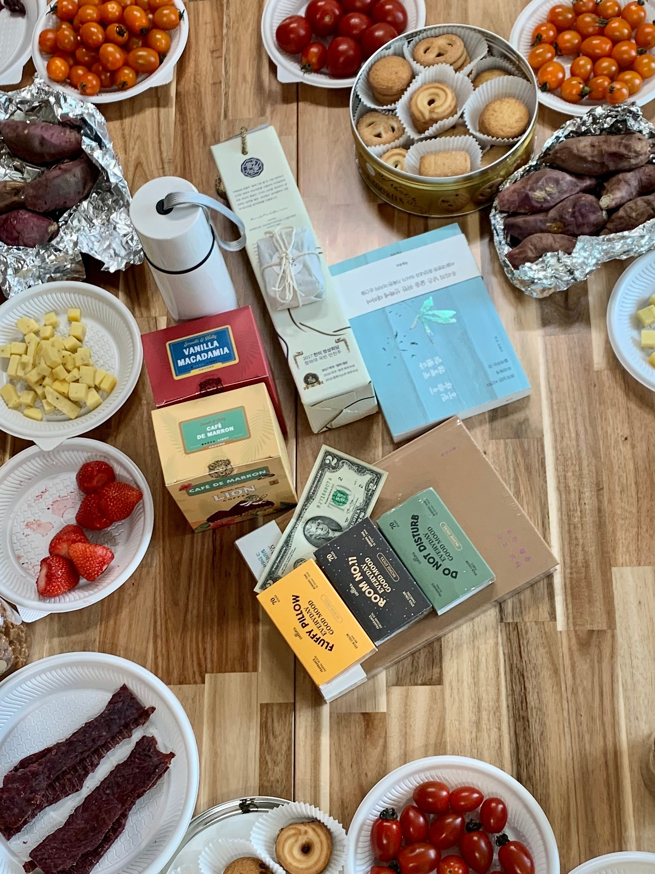 향, 책, 커피, 전통주, 그리고 누구는 미처 준비를 못했다고 지갑에서 행운의 2달러를 꺼냈고