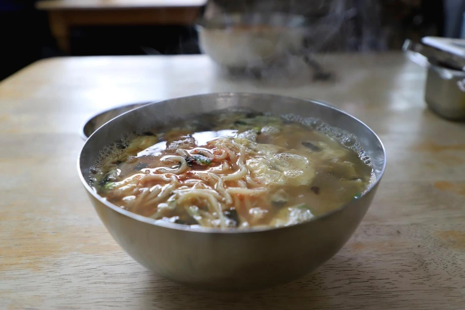 남자와 여자는 해장으로 칼국수를 먹는다.