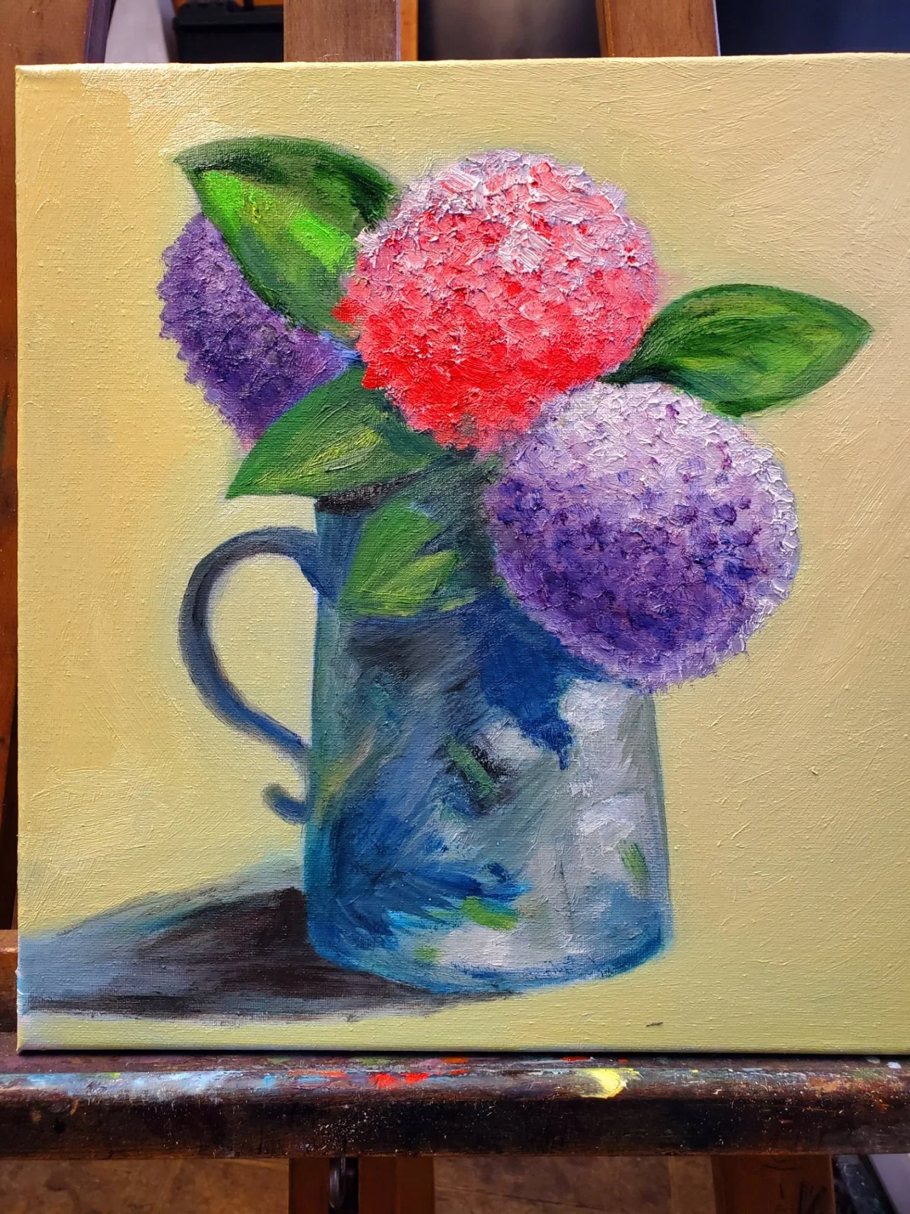 4가지색 물감이랑 붓을 사들고 첫 시간에 정물화를 시작하였는데 꽃병에 꽃인 다양한 꽃들을 그리려니, 이런저런 빨갛고, 노랗고, 혹은 보랏빛의 알록달록한 색상으로 어우러져 있었다.
