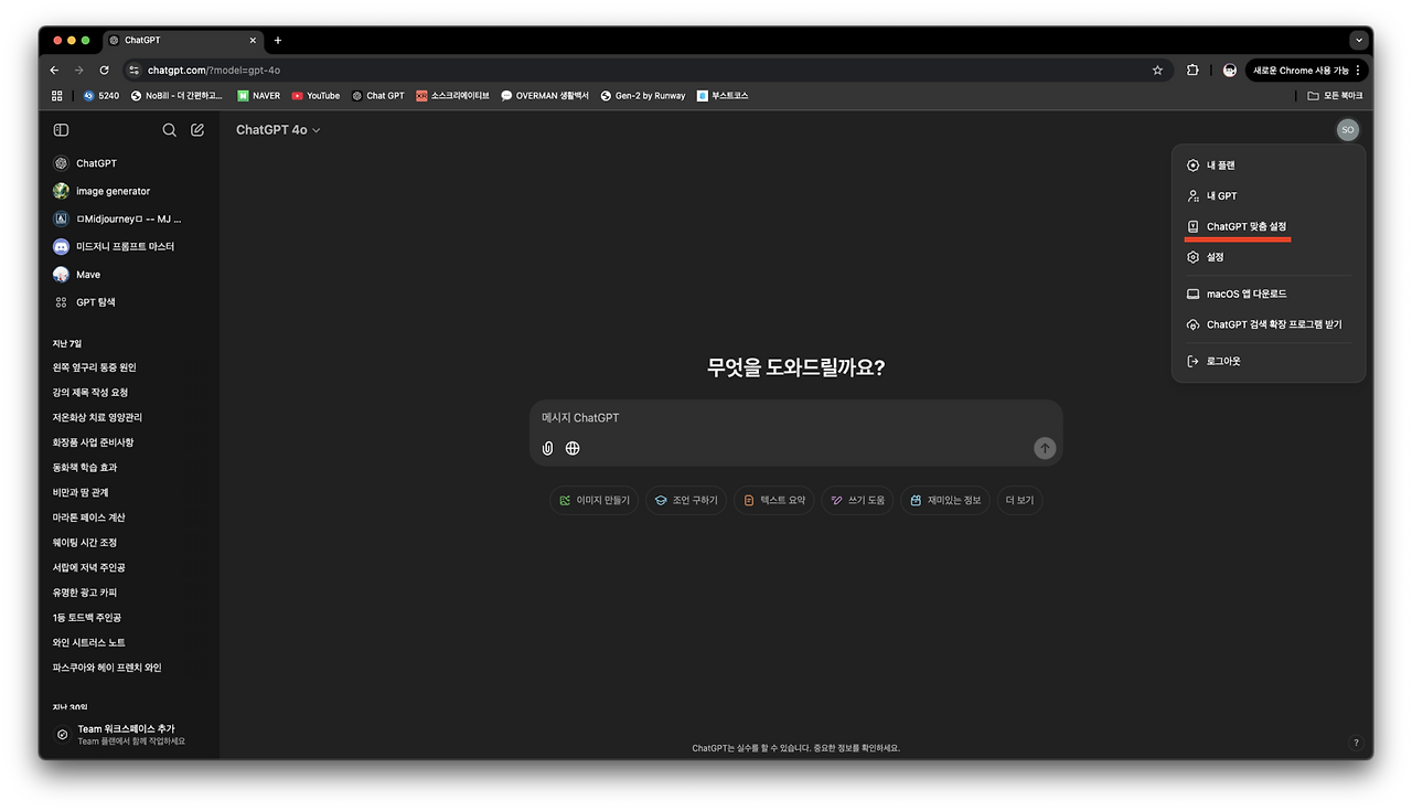 GPT에 로그인한 후 Home 화면에서 우측 상단 자신의 아이콘을 클릭하면 저렇게 'ChatGPT 맞춤설정'이란 창이 나오게 됩니다. 그리고 클릭을 해보시면 아래와 같은 화면이 나오게 될 텐데요.