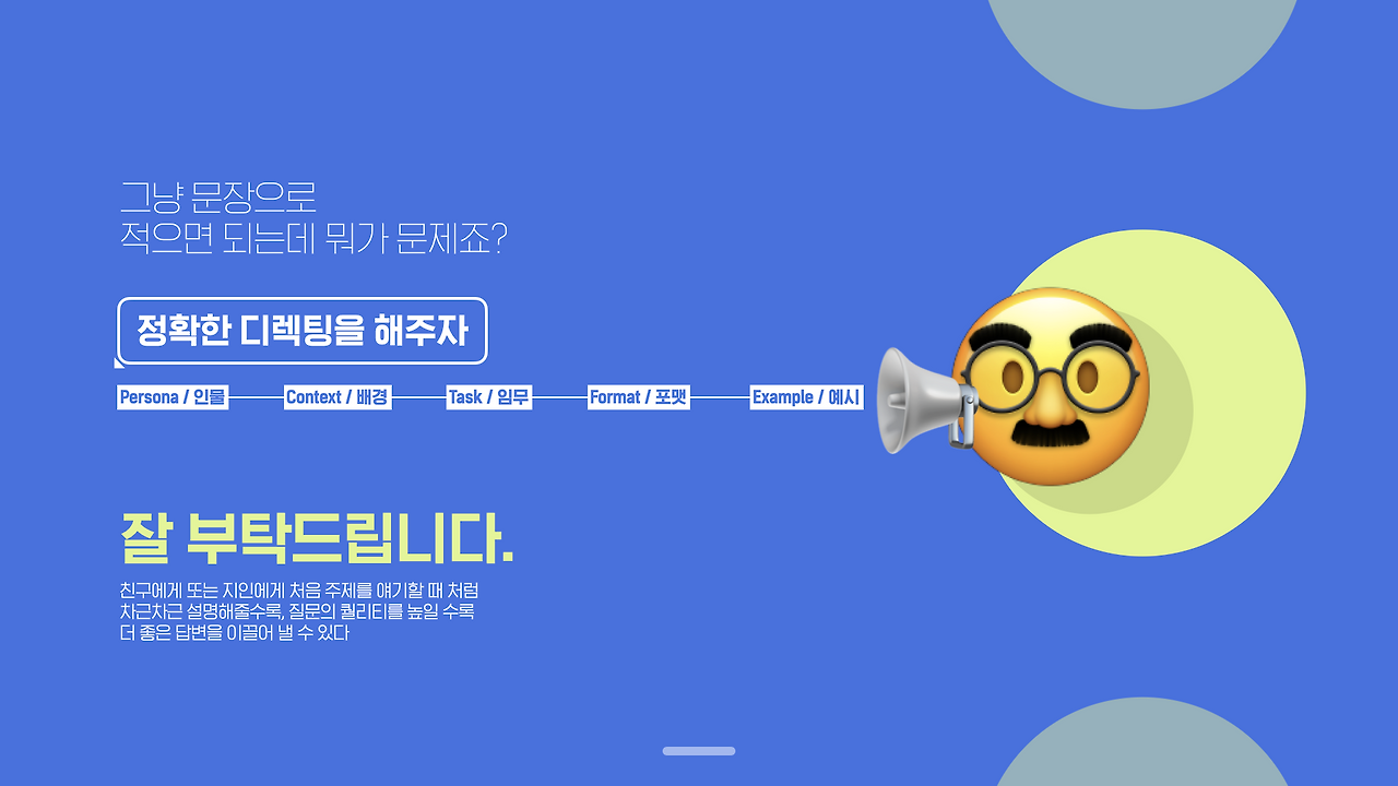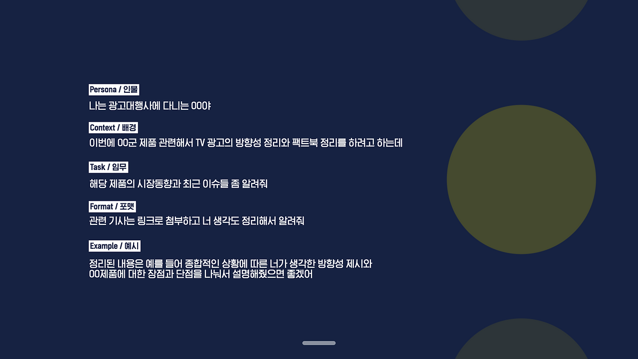 라고 물어봤을 때의 답변의 난이도는 확 달라지죠. 지금 질문 방식의 핵심은 차근차근히 원하는 내용을 명확하게 디렉팅 했다는 점과 GPT에게 '마케터'라는 역할을 부여했다는 것입니다. 초창기에 Chat Bot이 나왔을 때는 이러한 질문을 잘하는 방식에 있어서 GPT에게 역할을 부여하라는 내용의 글들이 많았습니다. GPT가 전문가의 시선에서 나의 질문에 전문적으로 답변할 수 있게끔 도와주는 거죠. 해당 정리법은 다양한 유튜버와 블로그, 심지어 뤼튼의 AI 질문 사용법에서도 사용하는 '프롬프트 작성 방식'입니다. 자연어, 즉 그냥 일반적인 언어로 편하게 질문해도 이제는 대답의 퀄리티가 높으나 앞서 보여드린 예시처럼 더 명확한 주제와 주체를 차근차근 설명해 준다면 더 명확한 소통이 가능해지기 때문입니다. 정확하게 내가 원하는 답변을 도출해 낼 수 있게끔 정확한 디렉팅을 통한 프롬프트를 작성하란 얘기입니다. 어렵나요? 안 어려움 계속 보세요. 제가 24년 초에 회사와 서울대에서 진행했던 수업 장표를 보여드려 볼게요.