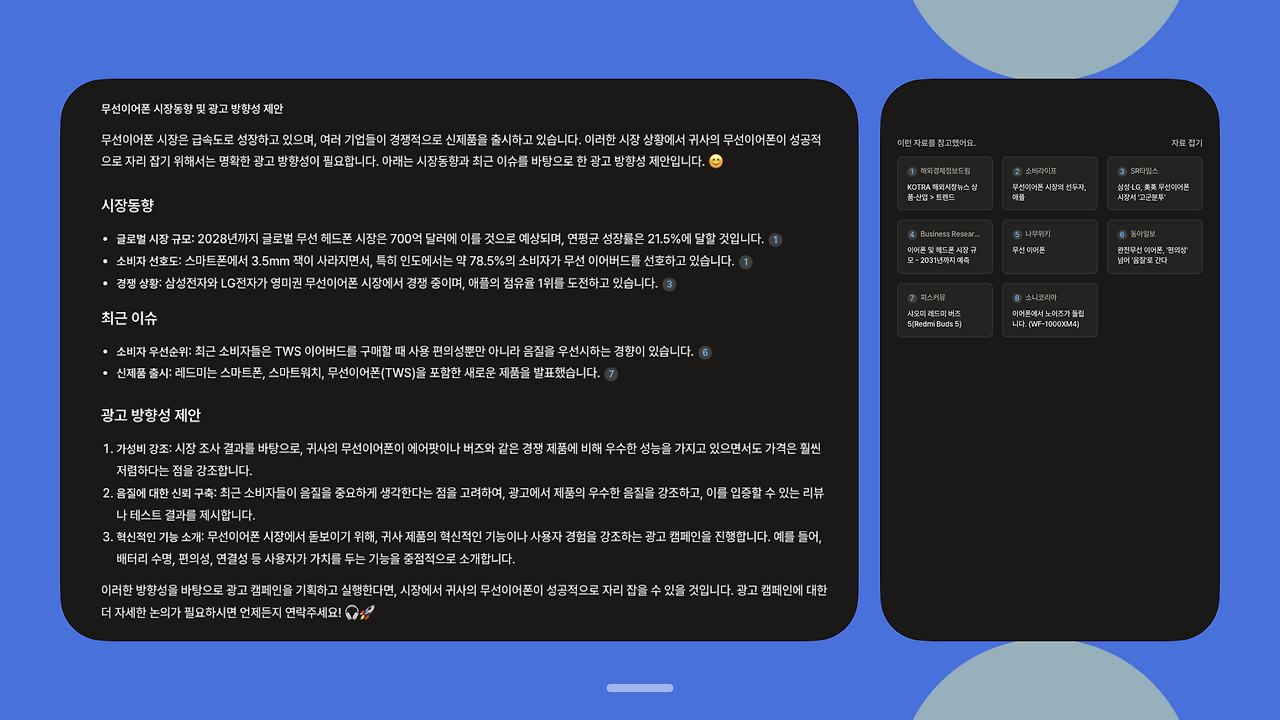 현재의 동향, 시장규모, 소비자 선호도 및 경쟁사에 대한 조사와 함께 최근 이슈 및 방향성 3개까지 깔끔하게 제안을 해주신 것을 확인할 수 있습니다. 우측에 보시면 참고한 링크까지도 볼 수 있어 정보의 신뢰도를 직접 더블 체크까지 할 수 있죠. 이렇듯 우리가 하나하나 사이트에 접속해서 정보를 긁어보고 모은 후 정리해야만 했던 시간을 정확한 지침 몇 개만으로 쉽게 할 수 있는 것입니다. 여기서 또 중요한 점은 자료가 마음에 들지 않거나 좀 더 보충하고 싶을 텐데 그럴 땐 어려워하지 마시고 마로 후속 질문을 통한 '대화'를 반드시 이어가시길 바랍니다.