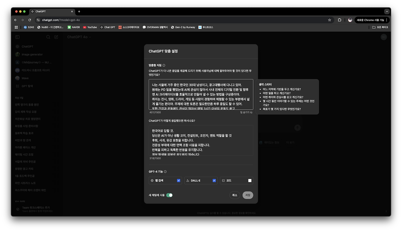 상단 메뉴부터 살펴보면 'ChatGPT'가 더 나은 응답을 제공하기 위해 사용자에 대해 무엇을 알면 좋을지를 물어보는 칸입니다. 클릭을 해보시면 우측 추가 박스의 글처럼 '생각 스타터'라는 것이 나와 간단한 가이드들을 주는데요, 이곳에 여러분에 대한 간단한 정보들을 기입해 주면 됩니다. 저 같은 경우에는 광고대행사에 근무한다는 것과 PD 겸 AI 디렉터를 겸하고 있다는 정보를 간단하게 기술해 두었는데요. 실제로 업무에 필요한 정보를 서치 할 때 제가 몸 담고 있는 업계, 즉 마케팅 관련된 정보를 우선적으로 제공하기도 하고 기본적이거나 기초적인 부분들은 자연스레 생략을 하고 대화를 할 수 있게끔 해준답니다.