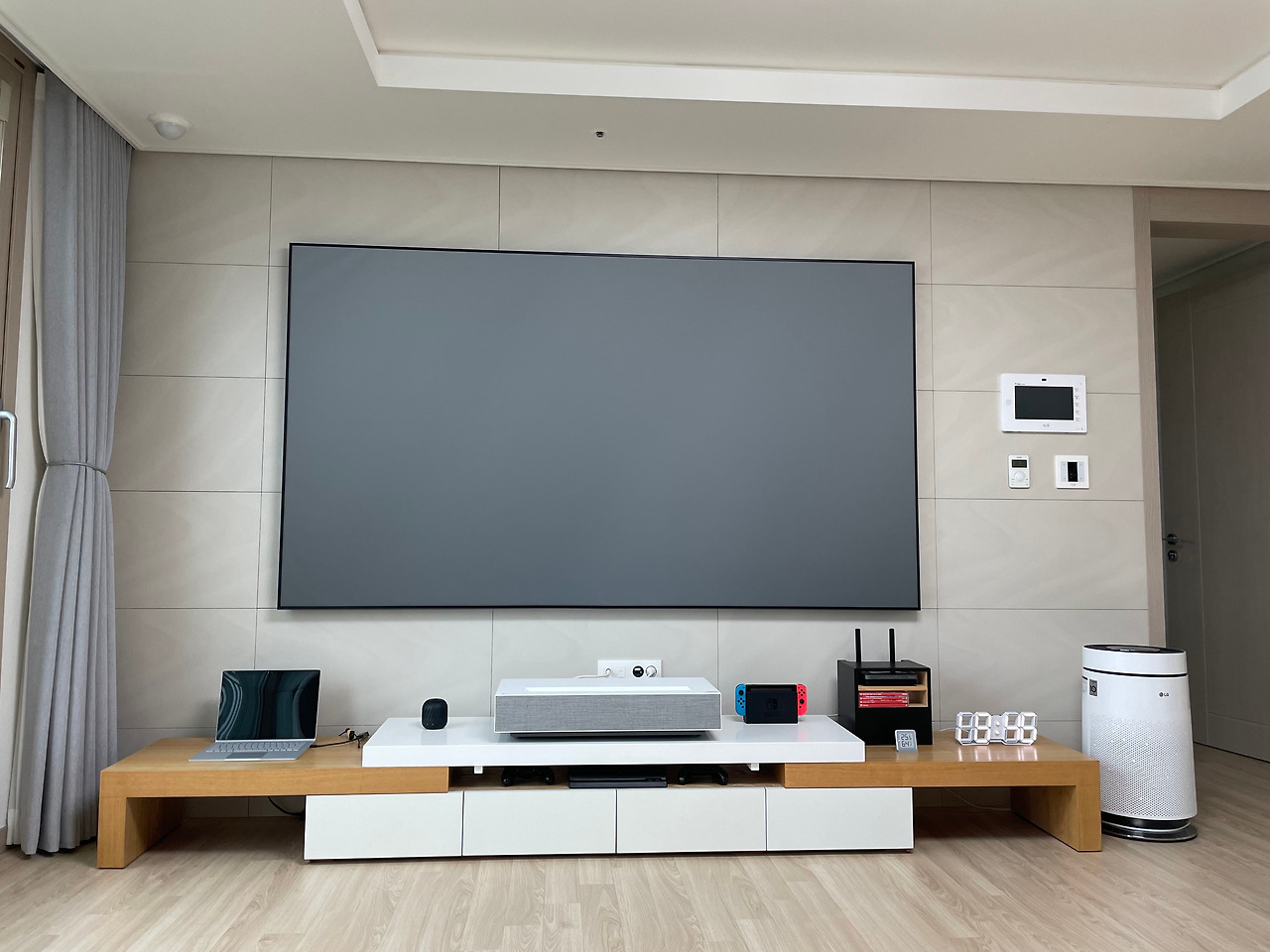 취향에 따라 화려한 색을 좋아하시는 분도 계실 텐데요. 저는 가능하면 아이보리, 그레이, 흰색, 검은색으로 가구와 전자제품, 벽지, 커튼을 통일된 색으로 선택합니다. 안정감을 주면서 전체적으로 깔끔해 보이는 효과를 줄 수 있습니다.