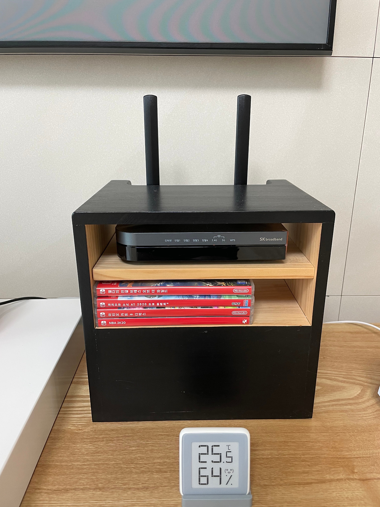 - 인터넷 와이파이 장비와 셋톱박스를 거치할 수 있는 수납장입니다. 선을 뒤쪽 공간에 숨길 수 있어서 좋습니다.