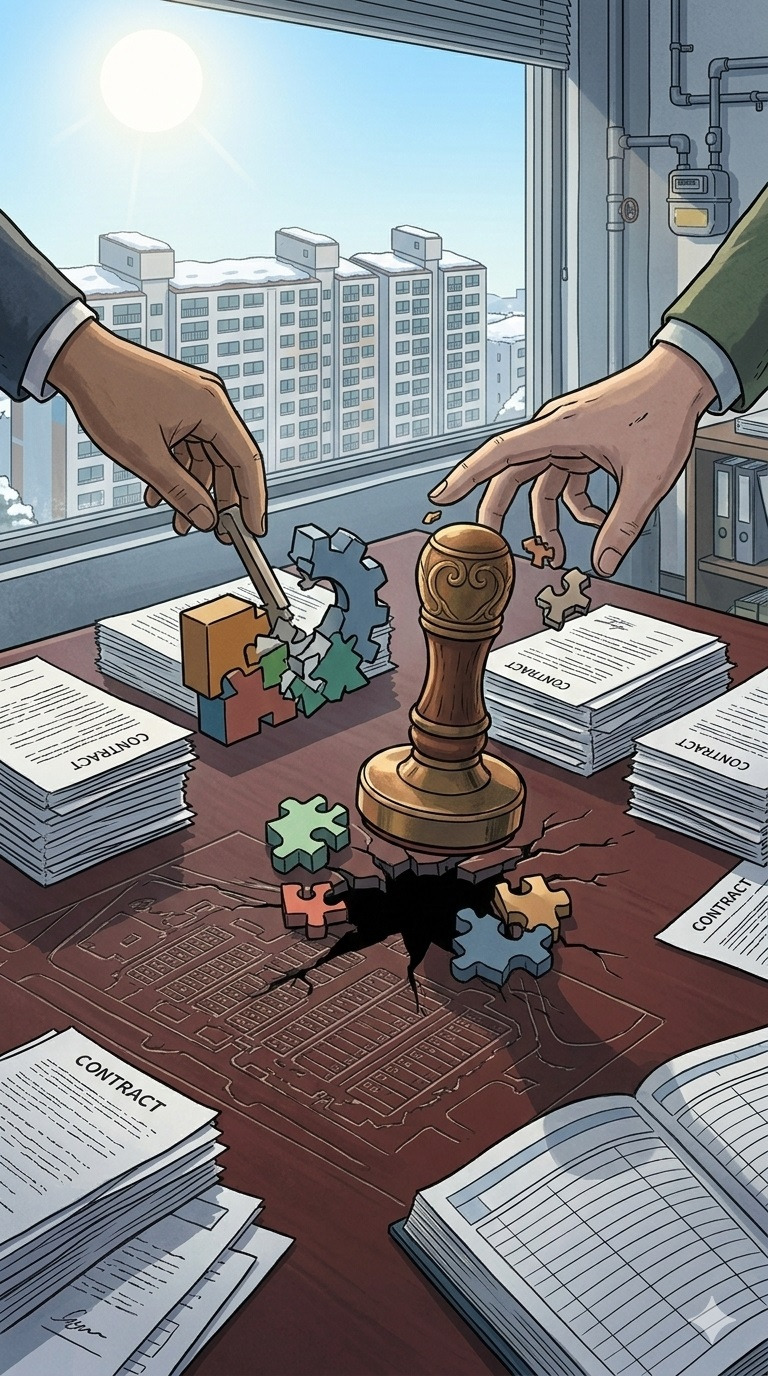 결과적으로 공동주택관리법상, 입대의의 공사, 용역 계약에 대한 관리, 감독 기능과 역할에 대한 참 허망한 결말이 아닐 수 없다. 맞는 거도 없고 틀린 경우도 없다. 옳지도 않고 그르지도 않다. 믿음은 물론 상호 신뢰 역시 존재하지 않고 상식과 '통념'조차 물 건너간 지 오래다. 입대의 의결정족수 미구성일 경우에도 관리주체의 공사, 용역 계약을 관리, 감독할 수 있는 통쾌한 해법이 빨리 사례로 나왔으면 좋겠다. 또한 '긴급한 상황'이라는 애매모호한 절차 무시의 상황 근거에 대한 보다 구체적이고 명시적인 규정 내용들이 법, 시행령, 시행규칙 그리고 지자체 공동주택 관리규약 준칙에 빠른 시일 내에 추가, 보완되길 기대해 본다.