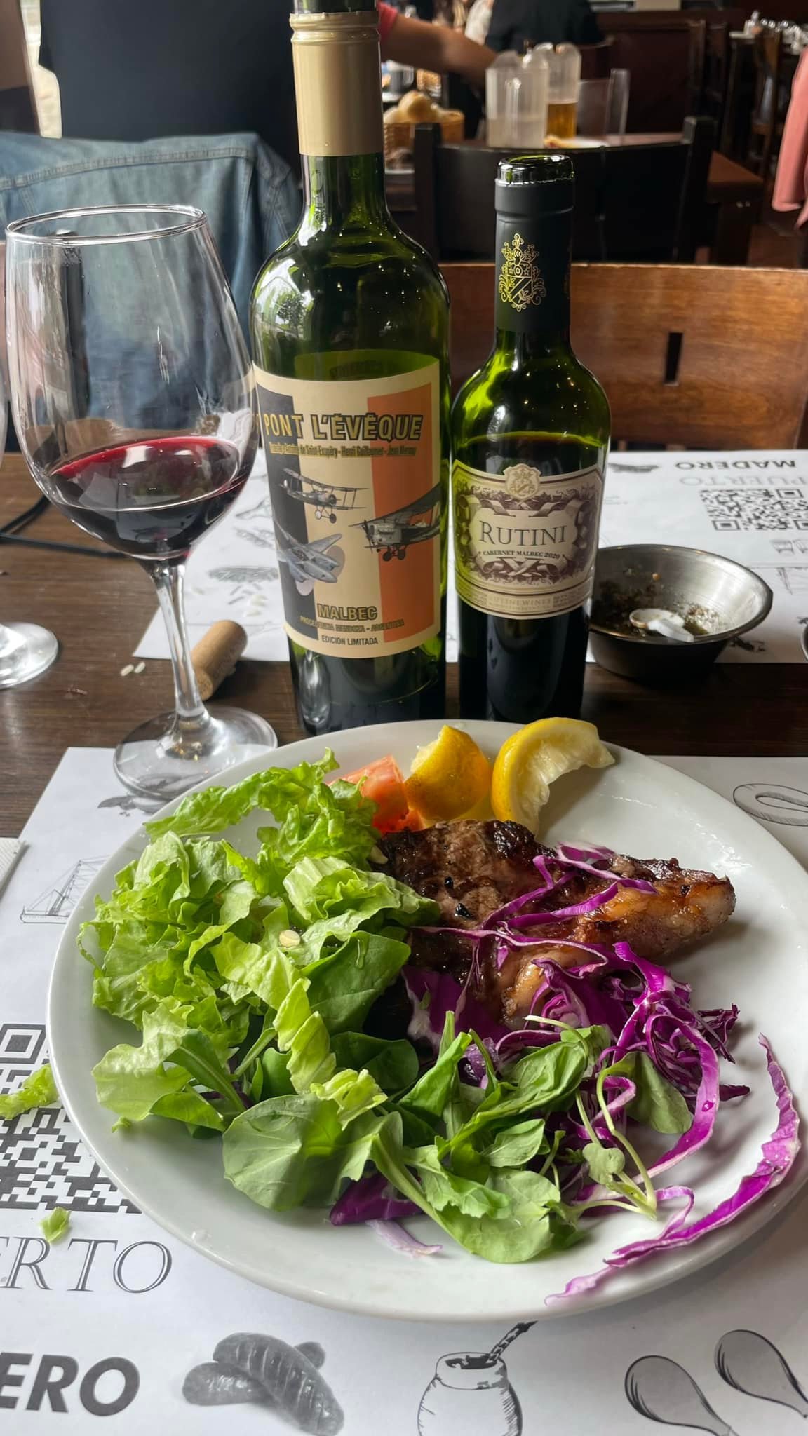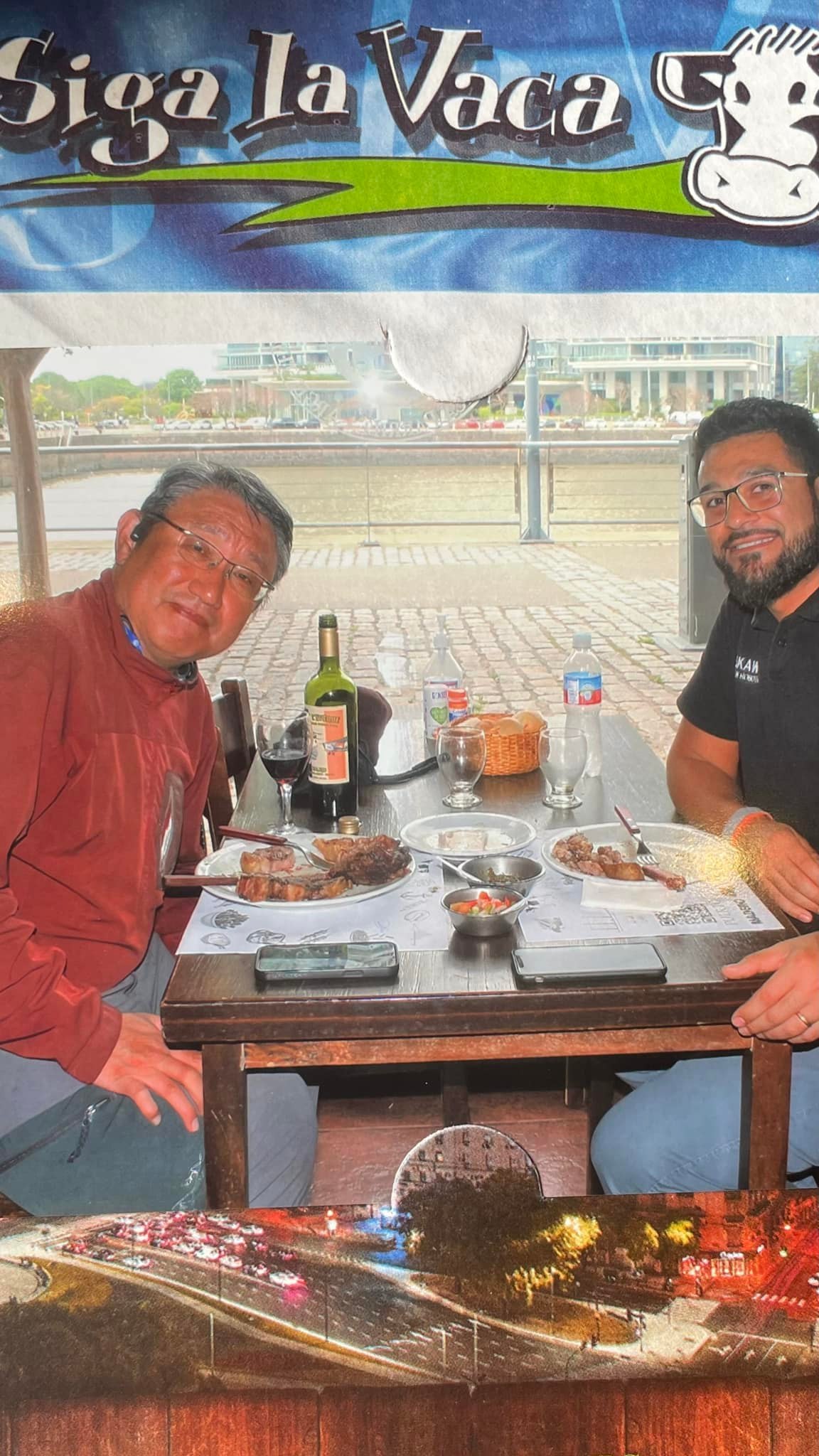 남미 대부분이 그렇지만 늦은 점심, 저녁과 더불어 평일임에도 새벽 1~2시까지는 거의 불야성에 가깝다. 그럼에도 불구하고 밤문화를 온전히? 즐기는 일은 불안한 치안 상황을 고려할 때 외국인 특히 현지 문화를 접하고 싶은 여행자에게는 도전 과제임에 틀림없다. 그래서 아르헨티나 첫 식사는 이른 점심시간을 택했다. 덕분에 일본 산업로봇회사 KASKAWA에 다니는 아르헨 친구 Elton Simões을 식당 앞에서 만나는 행운을 얻었다. 조심스럽게 강이 보이는 전망 좋은 자리에 앉을 수 있도록 통역을 부탁했고 흔쾌히 들어주었다. 동석해서 'Ancho(소고기 부위)'와 'Rutini Malbec(red wine from Mendoza)'까지 친절하게 챙겨 주었다! Keep in touch with my amigo! ( ¿Dónde comemos esta noche? Vamos a Siga la Vaca, es muy famoso por su carne.)