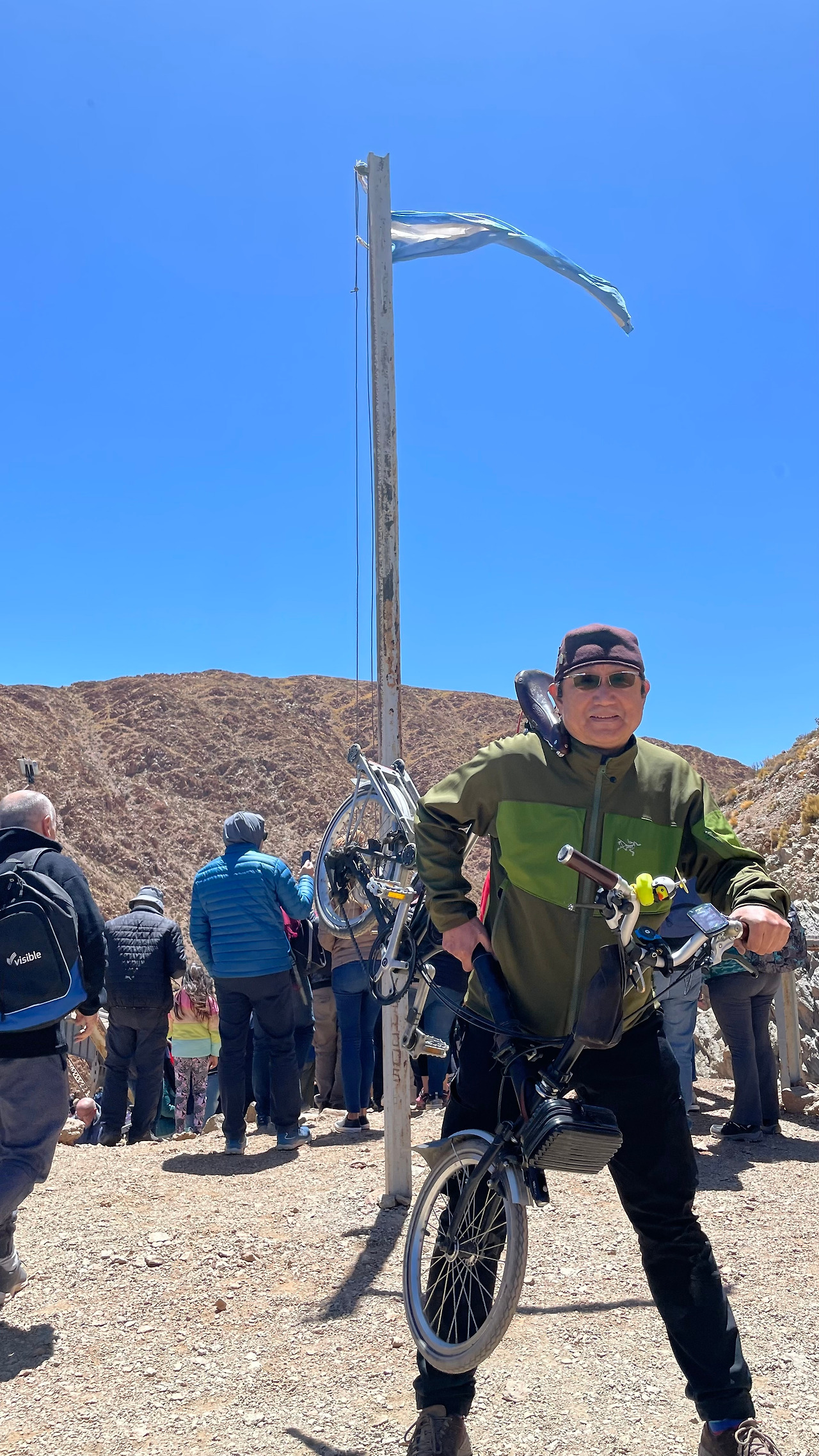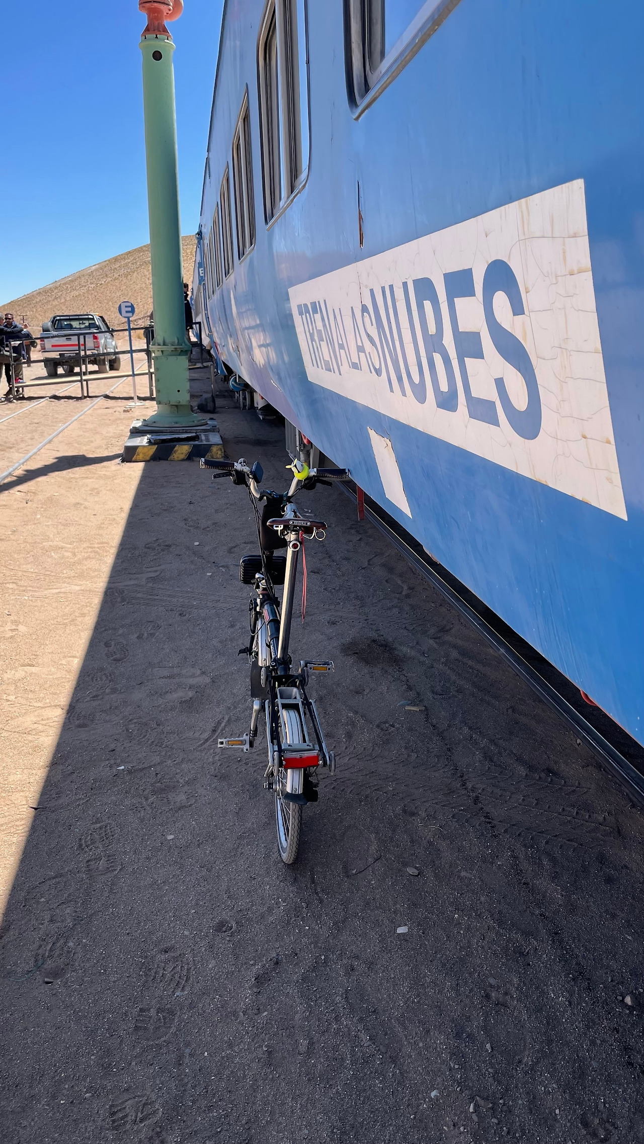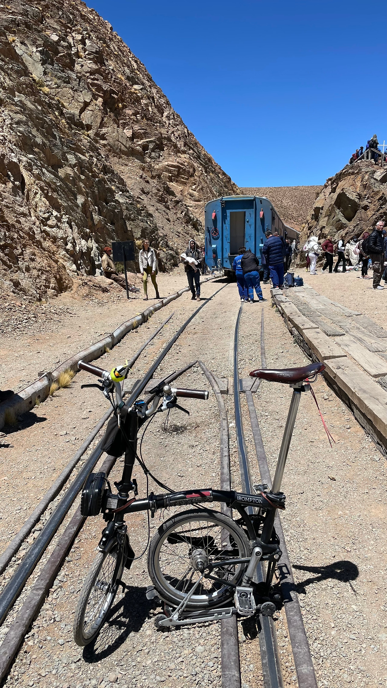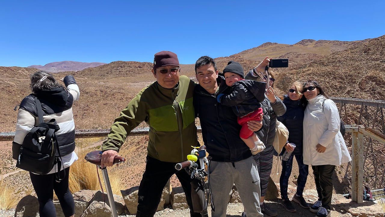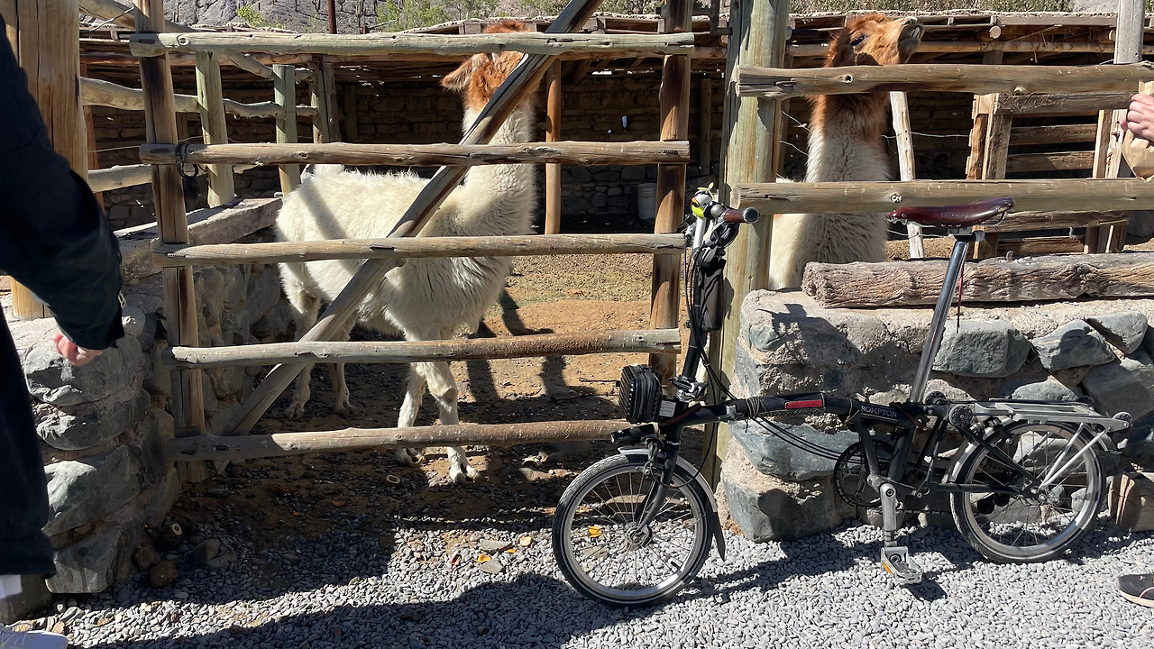 버스는 광활한 평원을 지나 구불구불한 산악지형을 왕복 열서넛 시간을 달렸다. 중간에 현지 마을에 들러 빵과 차에 불과하지만 '그곳' 점심 식사를 시식하고 생활 풍습을 보고 체험할 수 있는 기회도 제공해 주었다. 구름 열차를 타는 장소는 어느 정도 예상한 대로 꽤 고도가 높은 장소였다. 살타자체가 1200m 고지에 있는 도시인데 고산 열차의 고도는 4,220m이니 가이드의 '고산병'에 대한 염려와 응급조치에 대한 설명이 허투루 들리지 않는다. 다행인지 바쁘게 움직이지 않고 천천히 호흡을 하면 그리 큰 어려움은 없었다. 다만 브롬톤을 메고 끌고 타고난 후에는 숨이 좀 차오르곤 했다. 그래도 브롬톤 덕분에 관광객은 물론 현지인들과 많이 어울리고 대화를 나누는 기회를 누릴 수 있어서 많이 기뻤다. 그중에서도 아빠와 함께 온 너무 귀여운 모습의 꼬맹이와 남미 전역을 여행 중이라는 독일 연인들과의 손짓 발짓을 섞은 바디랭귀지식 언어 소통이 오랫동안 기억에 남는다.