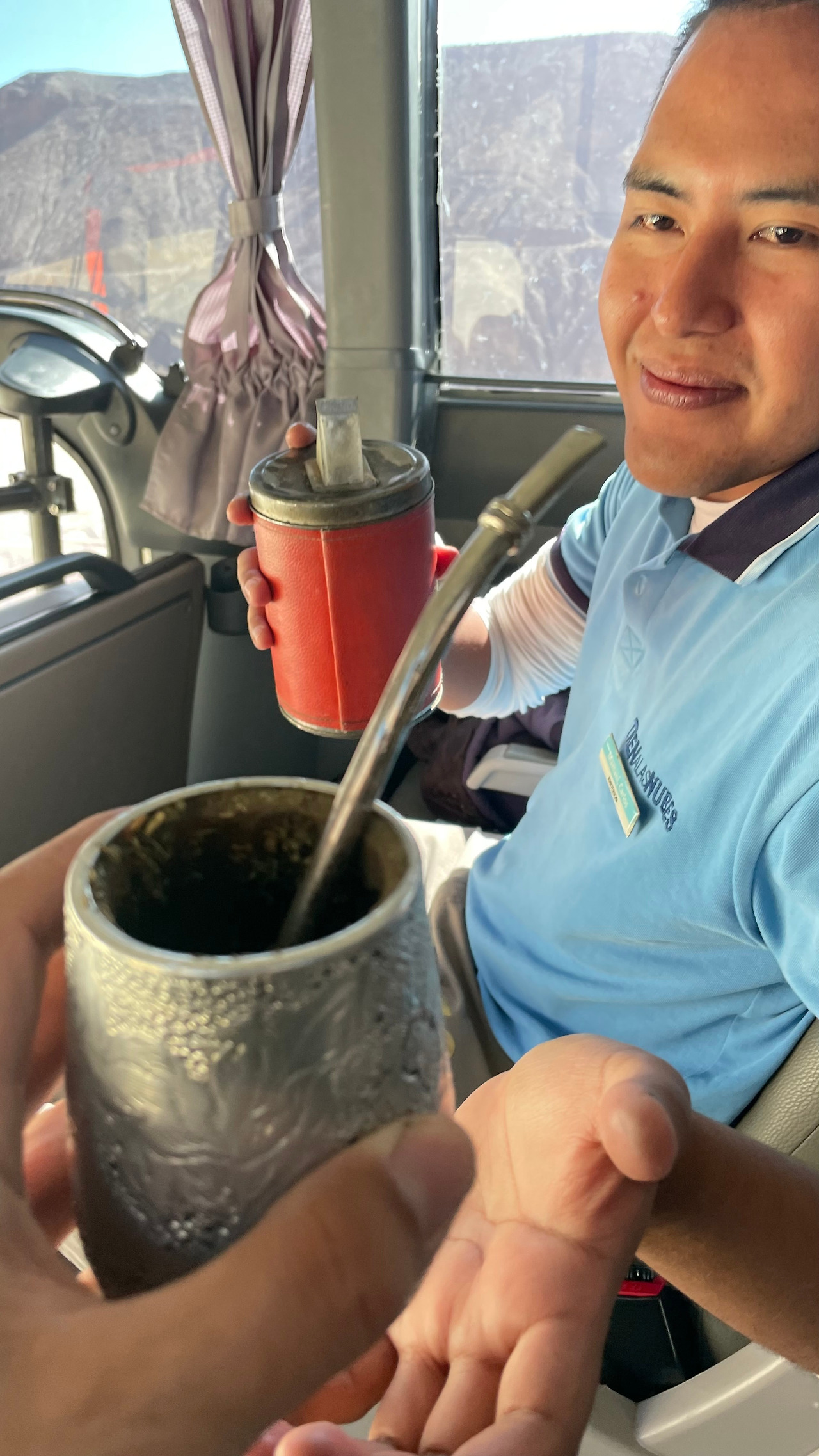 버스는 정시에 출발했다. 버스 10여 대에 빈자리는 없는 듯 느껴졌다. 우리 버스에 탑승한 안내자는 현지 토박인 듯한데 영어, 스페인어, 토착민 언어 모두 유창하다. 나홀로 여행의 장점 중 하나는 버스의 맨 앞자리인 안내자 옆자리를 차지할 수도 있다는 것이다. 넓은 앞유리를 통해 보다 큰 시야로 현지 자연 풍광을 즐길 수도 있고 사진, 영상 등도 다양한 각도로 촬영할 수도 있다. 더구나 영어로 언어 소통이 가능한 안내자까지 있으니 화룡점정(畫龍點睛) 일 수밖에 없다. 더구나 현지인들의 전통 차인 마테(mah-teh) 차를 수시로 권해주니 현지 문화를 제대로 즐기는 것 같아 즐겁다. 다만 나만의 스트로를 챙겨 오지 못해, 그 점이 좀 아쉬울 뿐이다. 여하튼 한나절 투어 일정 중 폭넓은 현지 정보를 가진 안내자와의 대화는 여러모로 즐거운 추억이고 실질적인 도움까지 제공해 주었다. 결국 시도에 불과했지만 티켓 환불 관련 담당 매니저와의 만남을 주선해 주었다.