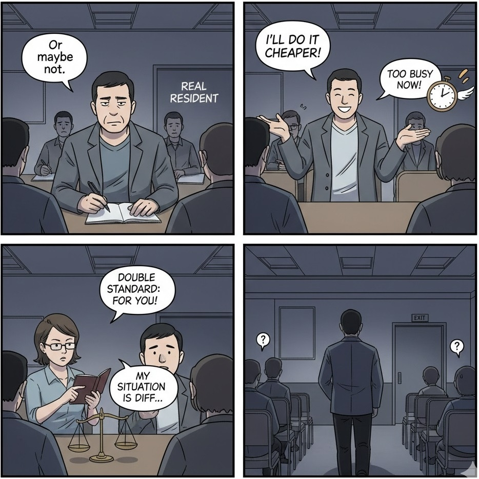 내가빠는 규정을 칼처럼 휘두르지만, 그 칼날은 언제나 타인만을 향한다. 그는 말이 어떻게 개인의 책임을 가리는 면책 장치로 작동하는지 보여주는 상징적 인물이다. 남의 실수에는 “공동주택 관리규약 위반”이라며 서슬 퍼런 잣대를 들이대던 그가, 정작 자신의 이해관계가 얽힌 사안에서는 마법처럼 논리를 바꾼다. “그땐 상황이 좀 특수했죠. 유통성 있게 해야지 너무 빡빡하게 굽니까?”