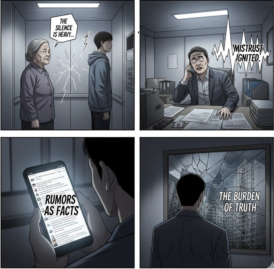 “회장님, 메시지가 너무 많아서 이제는 뭐가 사실인지도 모르겠습니다. 그냥 다들 자기 말만 맞다고 하니...” 정글북이 내게 보낸 개인 메시지에는 지독한 피로감이 묻어 있었다. 옆에서 이를 지켜보던 *창수 소장 역시 패닉 상태였다. 주민들의 질문은 쏟아지는데, 답변을 올리는 족족 새로운 의혹이 꼬리에 꼬리를 물었다. 사람들은 더 많은 정보를 원한다고 말하지만, 실제로는 감당할 수 없는 정보의 홍수 속에서 판단 능력을 상실해가고 있었다. 배리 슈워츠가 지적했듯, 너무 많은 선택지와 정보는 우리를 해방시키는 것이 아니라 오히려 결정 장애와 심리적 마비 상태로 몰아넣는다 [1]. 정글북은 이제 카톡방의 '나가기' 버튼을 만지작거리고 있었다.