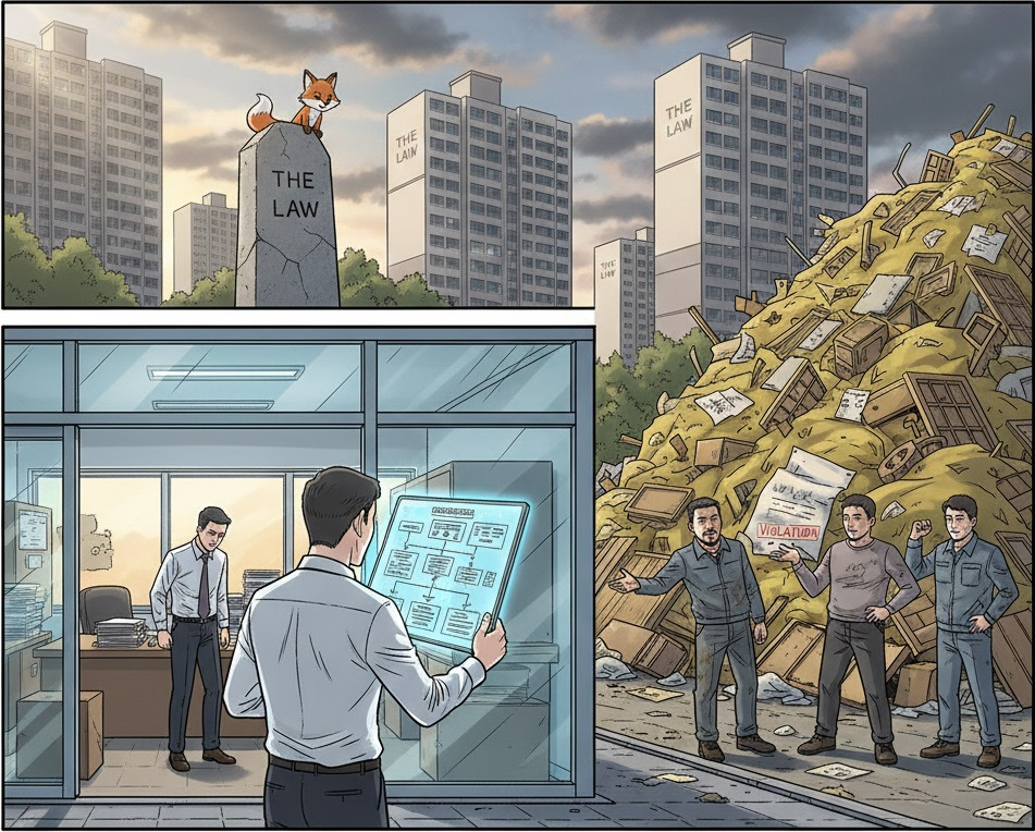 지하주차장에 폐기물을 산더미처럼 쌓아놓은 장식맨 역시 이 구멍 뚫린 그물을 비웃는다. "어이, 장식맨 씨! 이게 벌써 몇 번째요? 공용 공간을 당신 창고로 아는 거요?" 나의 서슬 퍼런 꾸중에 그는 비굴한 미소를 지으며 뒷머리를 긁적였다. "아이고, 회장님. 죄송합니다. 당장 치울게요!" 하지만 그의 눈은 웃고 있지 않다. '어차피 벌금 안 내고 버티면 그만인데'라는 독백이 그 비굴한 표정 너머 지층처럼 쌓여 있다. 규약상의 범칙금이 강제력을 갖지 못한다는 사실을 그는 이미 영악하게 간파하고 있었다.