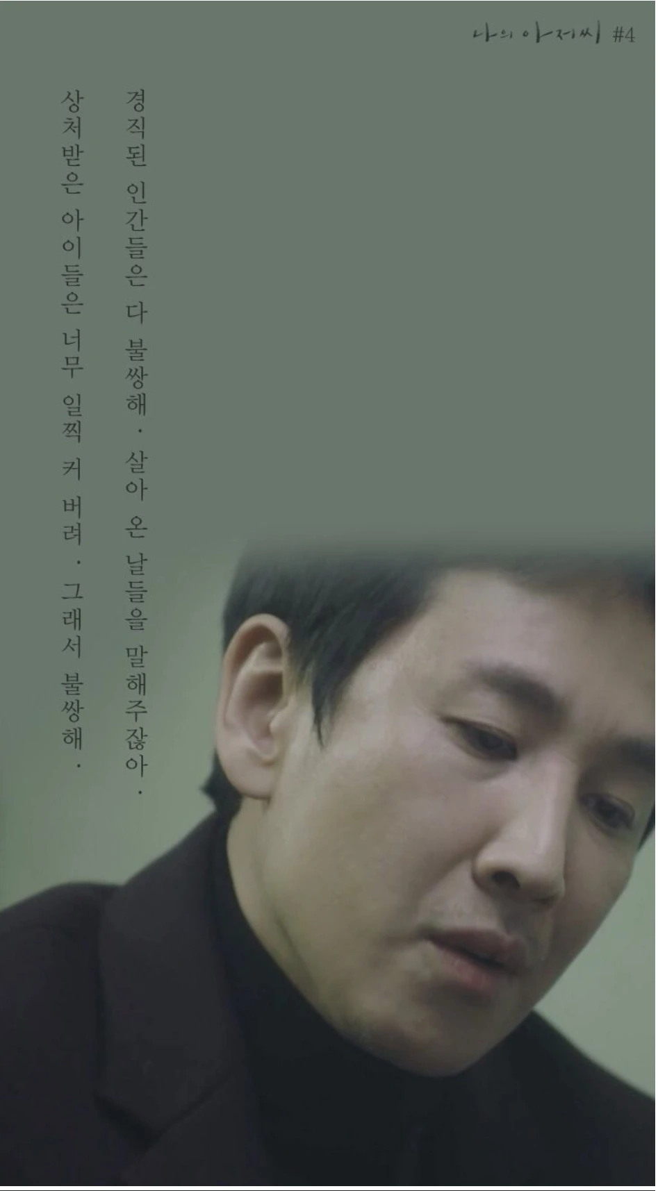 디스크로 두 번째 입원 후 3일째, 치료를 마치고 무료한 시간이 시작될 즈음, 나는 비장의 무기인 노트북을 꺼낸다. 글쓰기를 위해서도 아니고 일을 하기 위해서도 아니다. 그간 밀린 드라마를 보기 위해서다. 전편을 다운로드하여 야심 차게 미리 준비한 폴더를 연다. 제목은 <나의 아저씨>. 방영된 지 한참 지난 드라마지만 지인들의 추천을 많이 받은 터라 시간이 되면 한번 봐야지 생각했다. 총 16부작, 가문의 희망이자 기둥인 성실한 중년 박동훈(이선균) 아저씨와 알면 알수록 어두운 이지안(아이유)이 주인공인 드라마다. 나이를 초월한 로맨스인가? 하는 호기심과 기대감은 어른 맛 감동으로 보기 좋게 깨졌다.