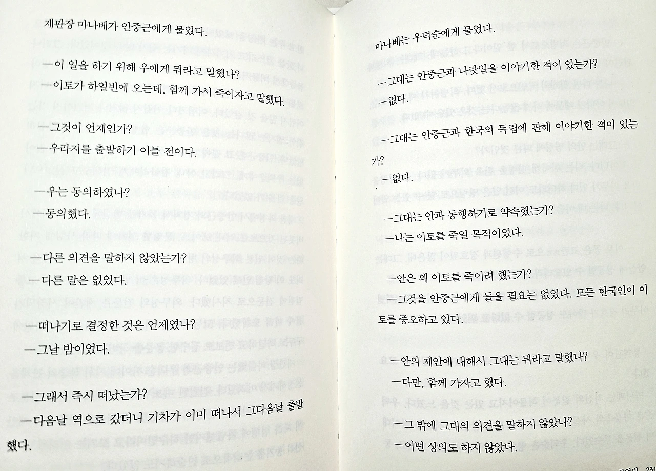 사내들의 말은 가깝고 다급했지만, 말 끝난 자리의 허허로움을 다들 알고 있었다. 안중근은 몸속에서 들끓는 말을 느꼈다. 말은 취기와 뒤섞여 아우성쳤다. 안중근은 말하지 않고 술을 마셨다. (59쪽)