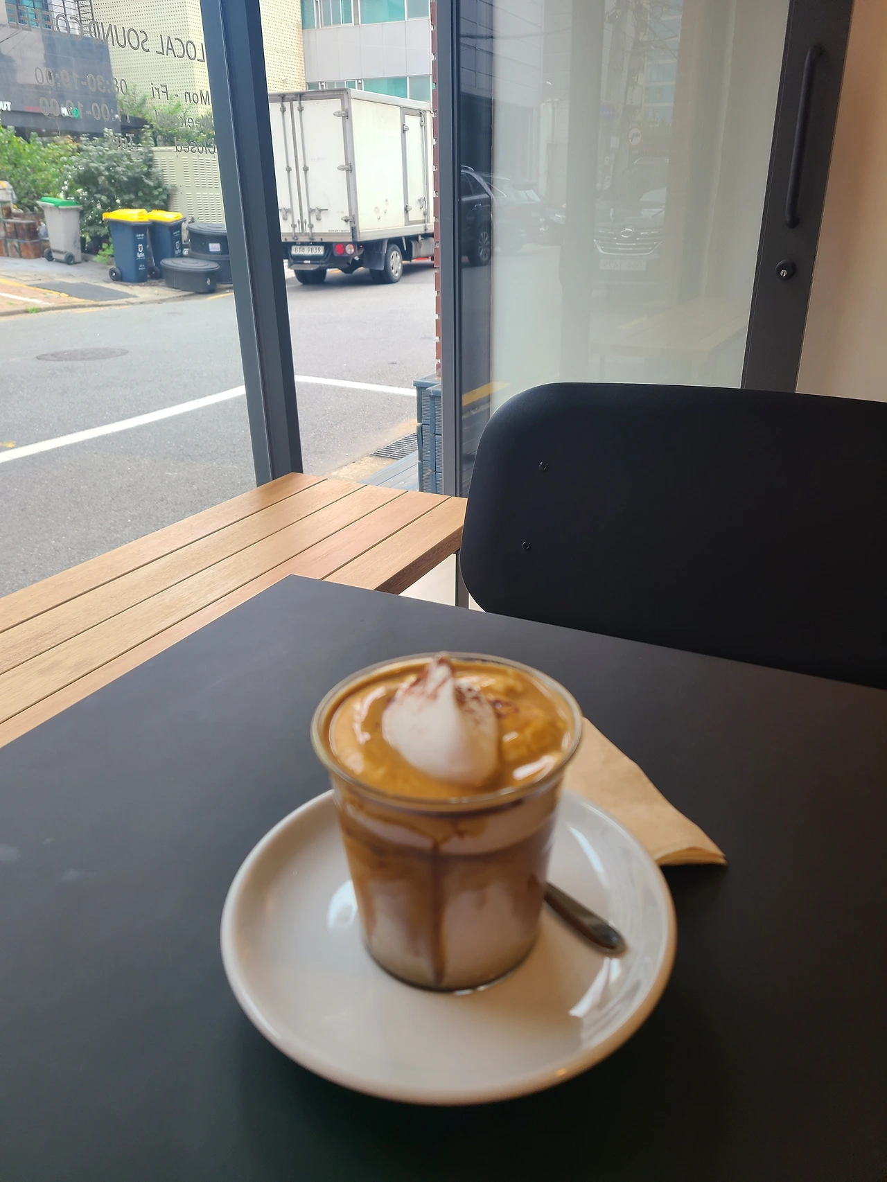 아침부터 먼 길을 왔어. 지친 내게 특별한 것이 필요해. 차가운 얼음, 부드러운 크림 위에 감춰진 바로 그것. 부드럽고 달달한 첫맛, 씁쓸하고 센 뒷 맛, 피로에 지친 내게 번쩍 에너지를 주는 너, 오늘도 고맙다.