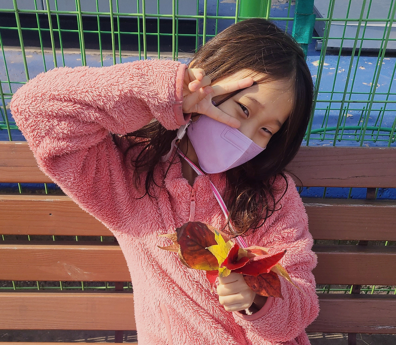 마지못해 따라나서긴 했지만 집 앞 가로수 길, 총천연색 단풍을 보더니 금방 신이 났다. 누가 시키지도 않았는데 형형색색 낙엽을 모아 작은 꽃다발을 만들며 걷는다. 그 모습이 귀여워 사진 찍자고 하니 앙증맞은 포즈로 환하게 웃는다.