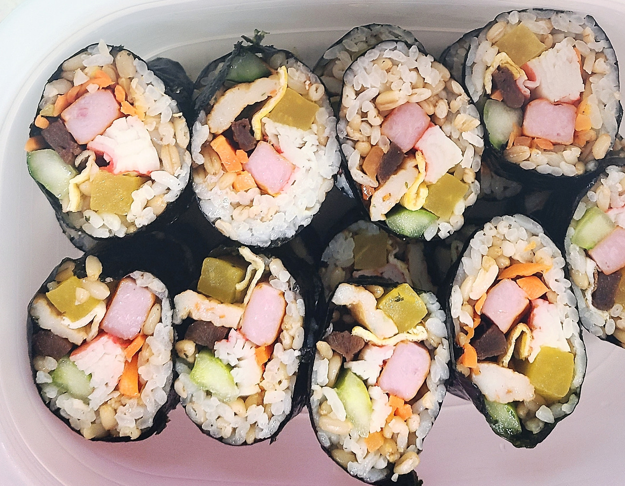 몸을 움직이면 통증이 가실까 싶어 일거리를 찾아본다. 지난밤에 사둔 김밥 재료를 모두 꺼낸다. 달걀 6개 꺼내 깨고 휘이~저어 지단을 만들고 오이는 껍질을 벗겨 자른 후, 소금에 절여둔다. 당근은 가늘게 채 썰어 센 불에 휘리릭 볶고. 햄, 어묵, 맛살도 차례대로 살짝 구워 길게 잘라둔다. 단무지, 우엉도 국물 쭉~짜내 네모난 큰 접시에 나란히 나란히 고이 담는다. 밥을 퍼서 양념을 하고 있으려니 남편이 일어나 나온다. 자연스레 김밥을 싼다고 선뜻 말해주니 쌩유베리 감사할 뿐. 뚝딱뚝딱 김밥 20줄을 싸고 가지런히 잘라 접시에 담는다. 동네에 친한 엄마가 큰아들 병간호로 집에 없고 그 집 아빠까지 코로나에 걸려 졸지에 초1 여동생의 유일한 보호자가 된 둘째 아들, 착한 초등5학년 소년을 위해 이쁜 김밥만 골라 소박한 도시락도 준비한다.