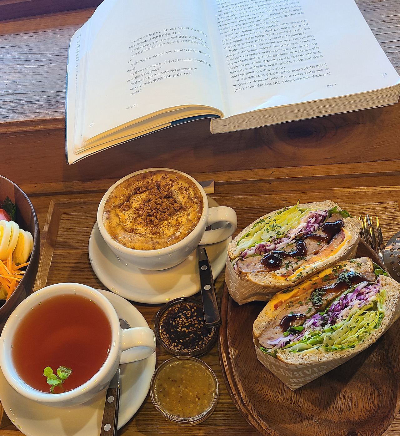 가을 단풍을 잔뜩 들고 부랴부랴 버스를 탄다. 도서관에 내려 예약해둔 책을 빌리고 막내도 좋아하는 책을 빌려 바로 옆 작은 카페로 간다.