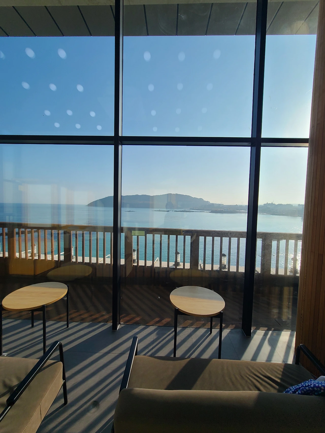 한참 걷다 보니 멋진 뷰를 내려다보는 카페가 보인다. 도시에서는 작은 공간에 테이크아웃을 주로 하는 빽다방이 여기서는 5층 건물 전체를 차지하고 우뚝 서있다. 따뜻한 라테 한잔을 주문하고 한적한 5층 루프탑에 앉는다. 바다가 한눈에 들어오고 선선한 바람이 알맞게 불어온다. 참 좋은 아침이다.