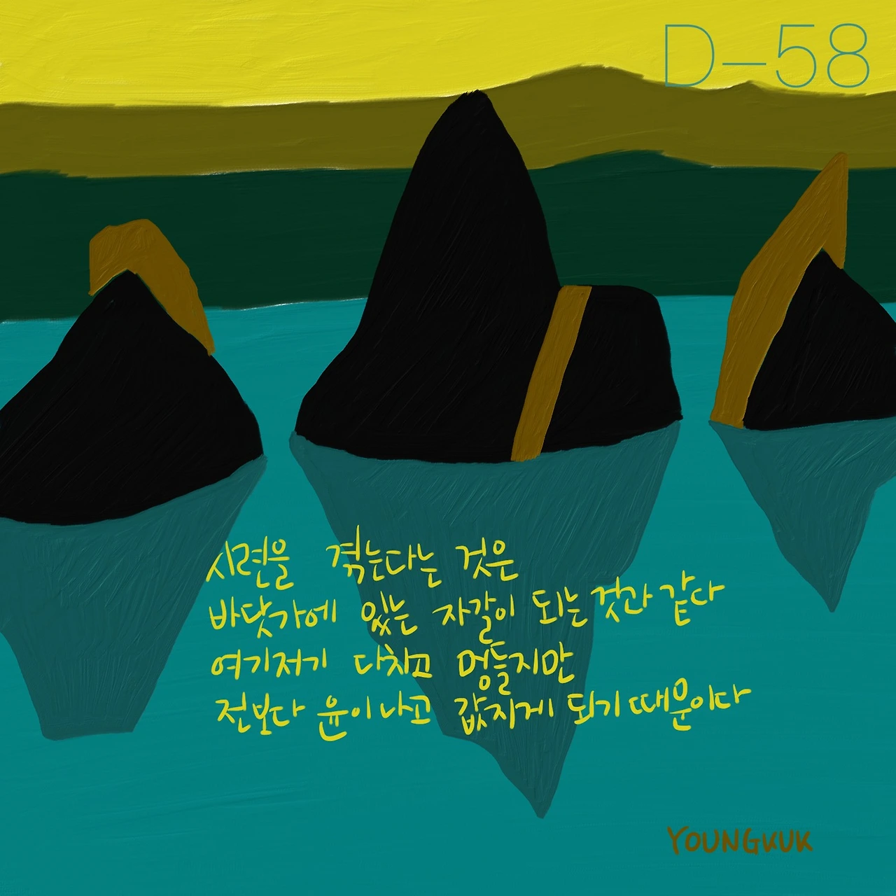 지금은 잠시 무너진 내 형체를 돌보고 꺾인 가지를 세우고 벌레 먹은 구멍을 수술할 귀한 시간이다. 이제는 남들의 무리한 요구에 온전한 내 형태를 누르고 고치는 바보 같은 일은 다신 하지 않으려 한다. 쉽진 않겠지만, 다른 이의 모난 각이 아픈 곳을 더 찔러 내 형태가 무너지지 않도록 두 눈 똑바로 뜨고 나만의 각과 형태를 갉고 닦아내 완성하는일에 열중해야겠다.