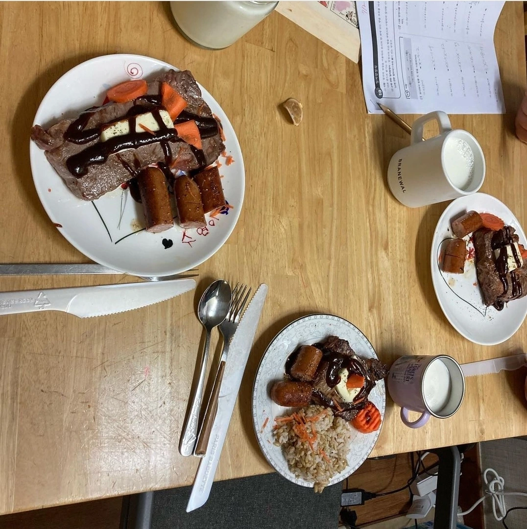 동생들을 위해 그녀가 차린 밥상. 소중히 모셔둔 1등급 등심 두 덩이를 가차 없이 제공해버리는 클래스. 제대로 구워 먹었을지 모르겠지만 일단 동생들 챙기는 갸륵한 마음이 기특해 고맙다는 댓글을 단다.