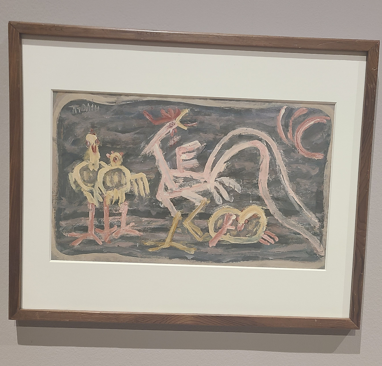 간단한 선과 단순한 형태로 닭을 생동감 있게 그려냈다. 화가 난 듯 꼬꼬 꽥~소리치는 수탉이 보이고 옆에서 멍하니 따르는 병아리 두 마리가 있다. 멈춘 그림인데도 실제 장면이 머릿속에 영화처럼 그려지고 소리도 들리는 것 같다. 살아있는 그림이다.