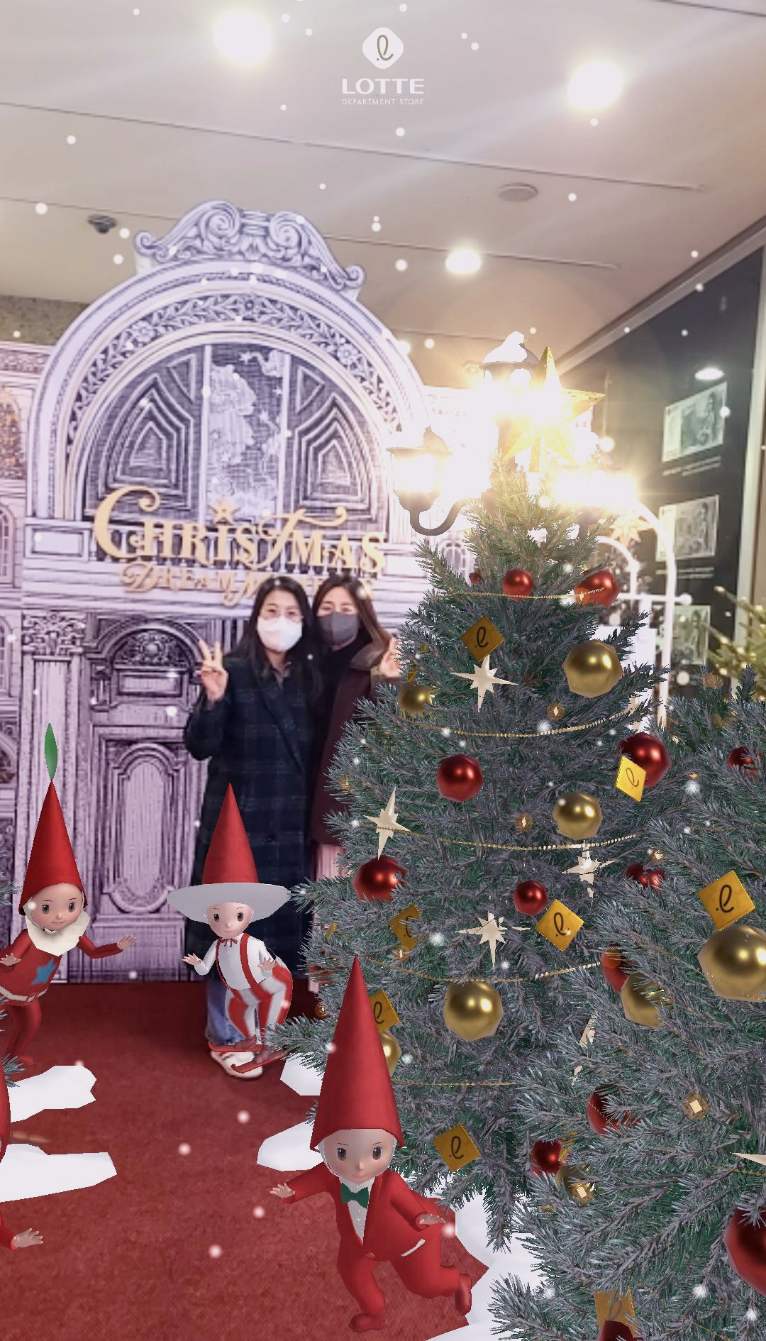 백화점 입구에서 QR을 찍고 휴대폰 카메라를 보니 요정들과 트리가 짜잔 하고 화면에 나타난다. 2022년 최첨단 연말은 달라도 많이 다르다.