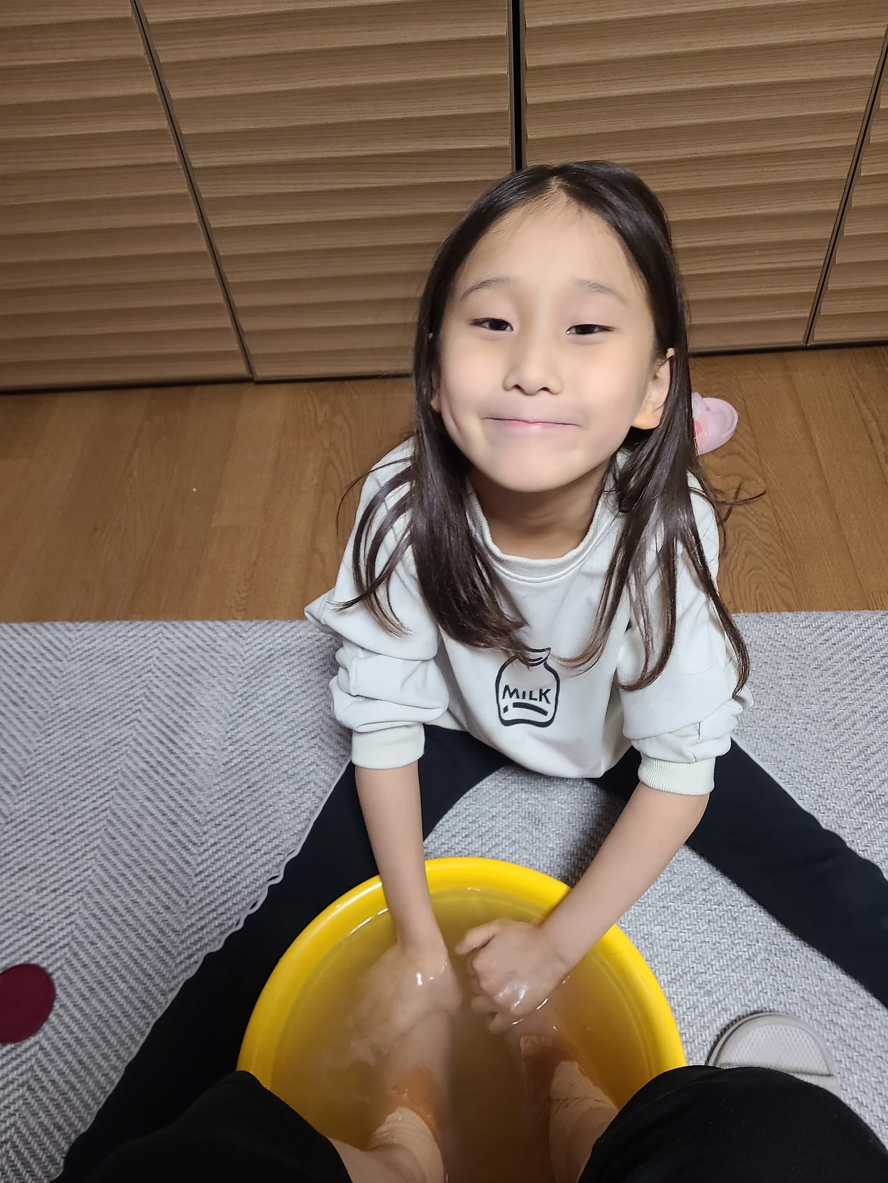엄마, 여기 발 담가보세요. 내가 만든 비누로 마사지해 줄게요.