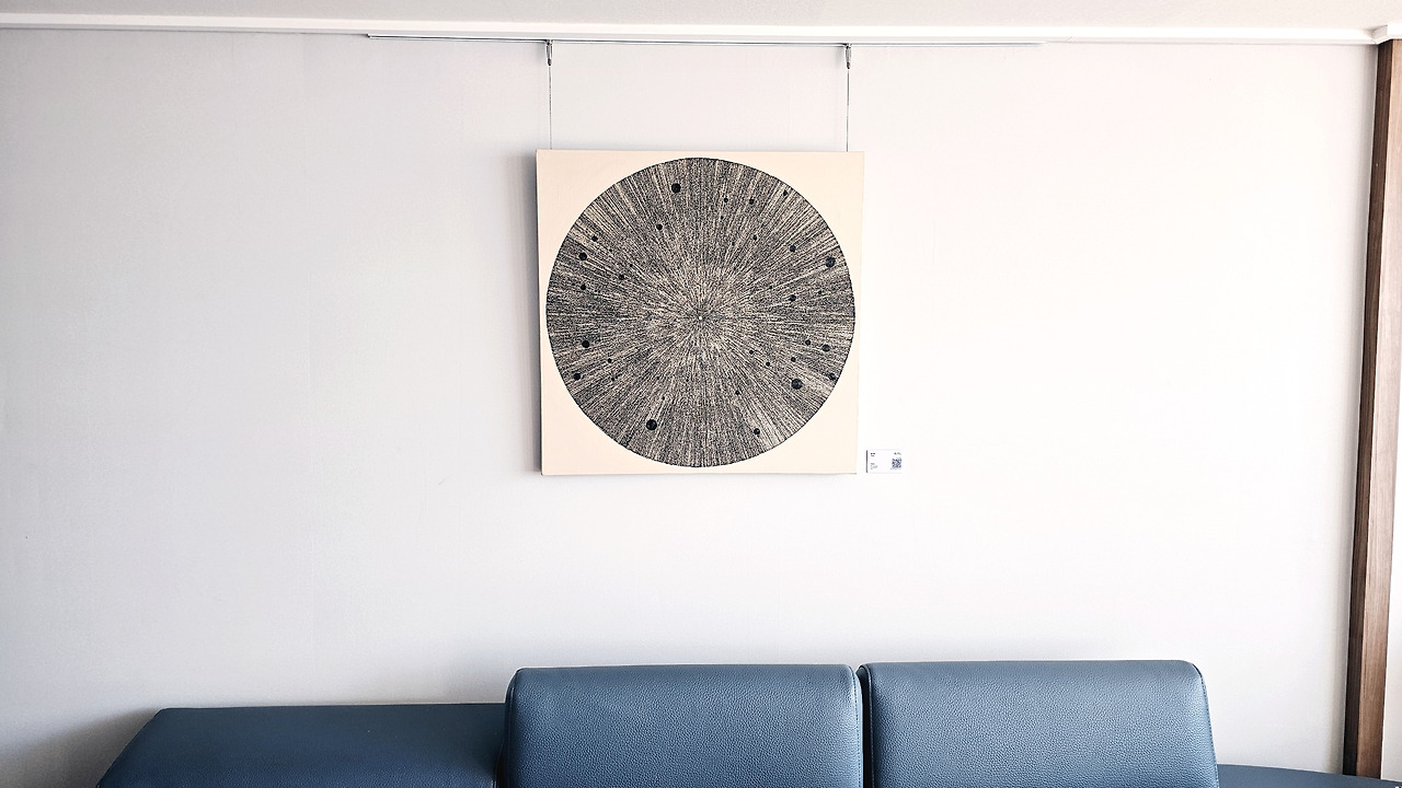 집안식구들은 그림을 보자마자 다트판이냐 블랙홀이냐 이런저런 반응을 하고 이 와중에 막내는 멋지고 보기 좋다 말해주는 센스를 발휘한다. 역시 막내는 눈치와 생존능력이 탁월하다. 렌털이고 고가의 물건이라 부담되긴 하지만 그래도 그림 한 점이 색다른 대화의 물꼬를 터주어 다행이라 생각한다. 이벤트가 끝나면 다시 비용이 올라 반납하게 되겠지만 먹고사는 일과 관련된 것 말고 보고 즐길 수 있는 고상한 작품 하나가 우리 집에 잠시 머물러 있다는 사실만으로 손님 같고 쳐다보게 되고 새로운 분위기가 신기하고 재밌다.