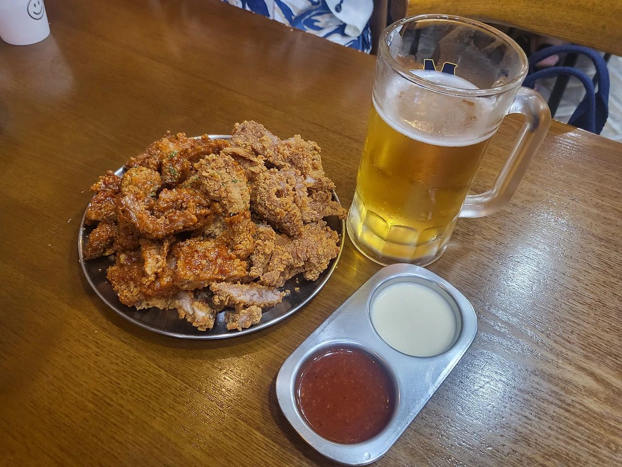 지인이 반드시 먹어야 한다고 강추한 갈비후라이드 먹으러 정주행. 먹거리가 즐비한 깡통시장을 한 눈 팔지 않고 잰걸음으로 직진한다. 시장의 끄트머리에 발견한 "깡돼후" 간판. 야심 차게 돼지갈비 후라이드 중자 한 접시를 시키고 생맥주는 500cc 한 잔. 아주 소박하고 심플한 식탁이다. 평소 같으면 상상도 못 할 적은 양지만 소탐대실을 가슴에 새기고 안전한 여행을 위해 조금씩 자주 먹기로 노선을 정한다. 진정한 먹방의 고수는 맛난 음식 하나에만 집중하는 법. 각설하고 일단 한 입 베어문다. 음~ 뭔가 흔히 먹는 치킨과는 다르다. 바삭한 튀김옷은 비슷한데 튀김옷의 두께가 얇고 살은 퍼석한 닭과는 식감이 다르다. 쫄깃하고 부드러운 돼지갈비의 속살이 젓가락질을 멈추게 하지 않는다. 그런데 여기서 끝이 아니다. 꼭 같이 먹어야 할 환상의짝꿍이 있었으니 그것은 치킨무? 아니다. 단돈 천 원짜리 콘샐러드! 이것을 추가해야 비로소 환상의 맛이 완성된다.여행 다녀온 지 한 참 지나 글을 쓰고 있는 지금도 군침이 도는 건 그만큼 중독성 있는 맛이라는 증거!