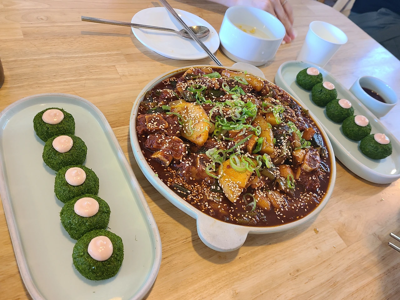 호출을 받고 자리에 앉아 잠시 기다리니 눈이 호강하는 비주얼의 음식이 순서대로 나온다. 초록색 감태에 굴려 핑크색 소스를 품은 꽃 같은 형태의 음식 이 주먹밥이라니. 먹기아까울 정도로 이쁘다. 담백한 주먹밥에 달콤 짭짜름한 고기한점 넣으니 천상의 맛. 금강산도 식후경이라고 맛있는 음식은 여행의 빼놓을 수 없는 즐거움이다.