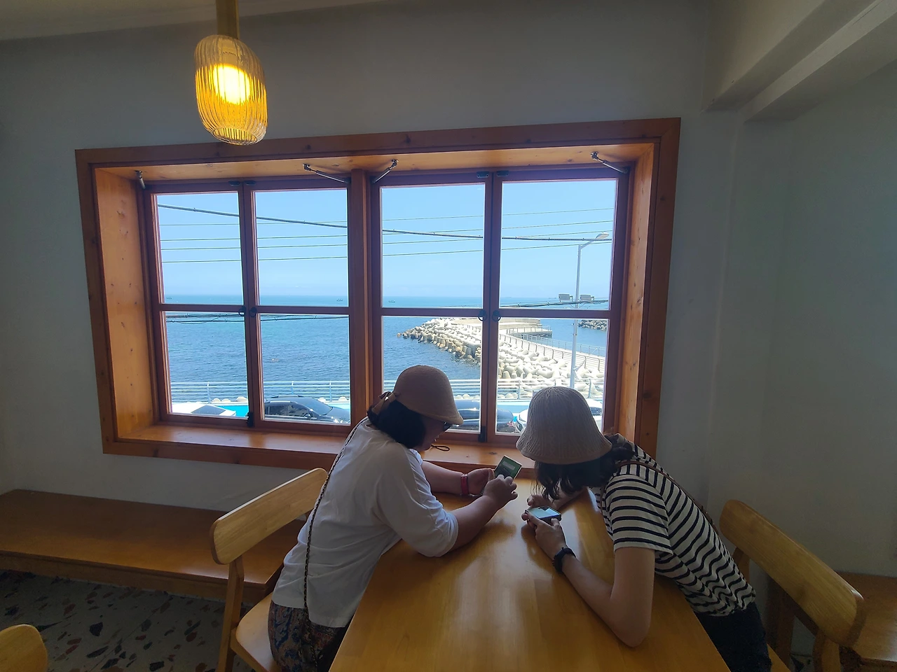 다음 행선지는 송정해수욕장, 기장에 있는 해동용궁사에서 차로 15분 거리다. 택시를 타고 오는데 해변 드라이브 코스가 멋지다. 감성적인 카페와 맛집들이 늘어서 있고 조용한 바다도 함께 펼쳐진다. 우린 미리 정해둔 퓨전한정식집 "소옥"으로 간다. 깔끔한 2층 건물에 1층은 식당, 2층은 대기실이다. 주문을 하고 대기실에 올라오니 이것은 무엇? 대기실이 카페 못지않게 뷰맛집이다. 통창으로 바다가 한눈에 들어오니 창문이 액자인 듯 인물도 풍경도 이뻐서 어디에 카메라를 대도 그림 같은 작품이 나온다.