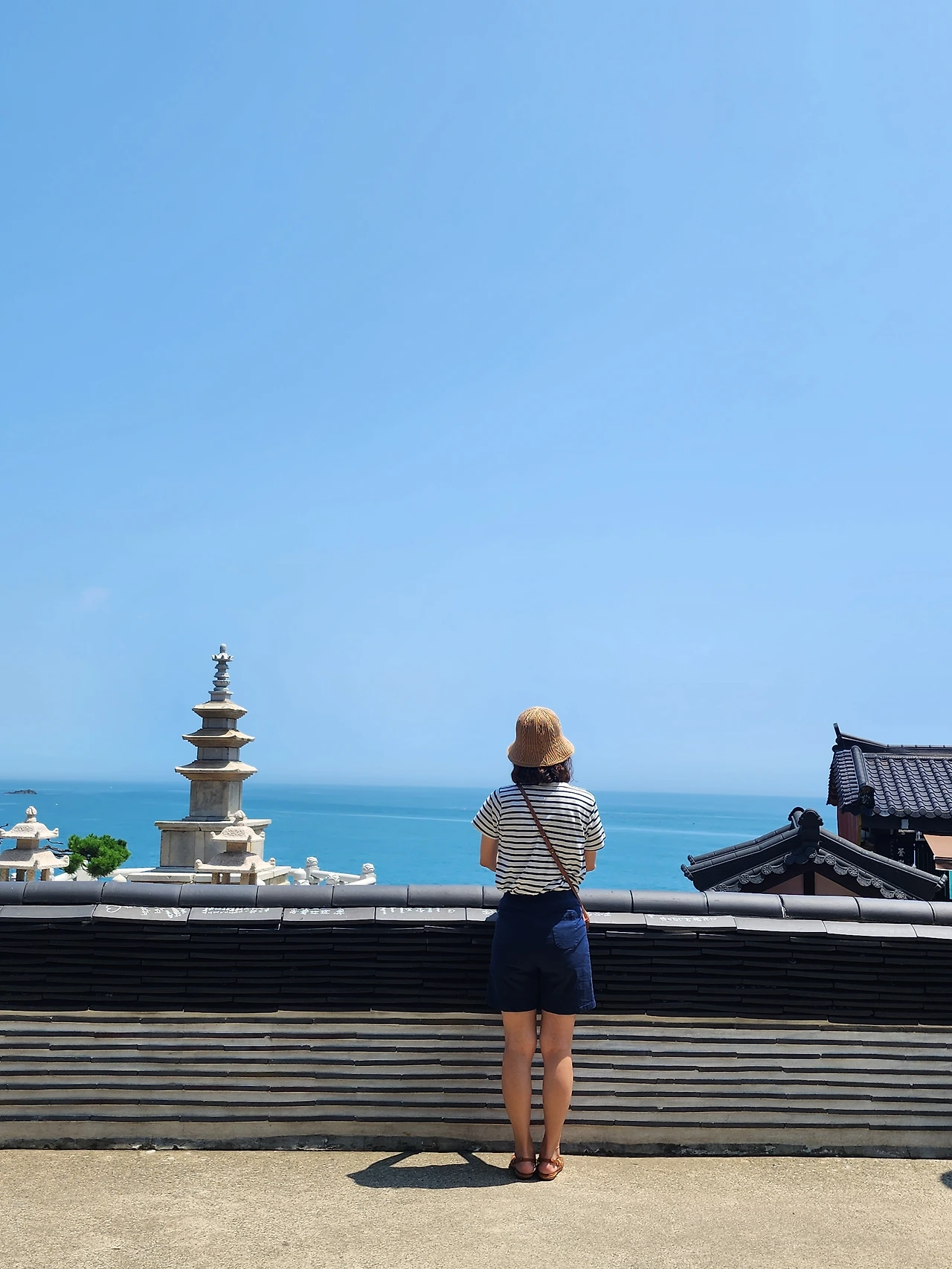 푸른 바다를 배경으로 한 모습이 한없이 고요하다. 사람들은 계속 드나드는데 탁 트인 공간 앞에 시간이 멈춘 것 같다. 거기에 바닷바람까지 시원하게 불어오니 여기서 잠깐 머물고 싶은 마음이 든다. 대웅전 앞에 아무 데나 걸터앉아 한 동안 물멍한다. 느릿느릿 여행이라 생각 없이 필요한 만큼 쉬어갈 수 있어 더없이 좋다. 그렇게 한 동안 바다에 먼 시선을 드리운 채 앉아 각자의 마음속에 있는 바람과 소원을 바닷바람에 실어 보낸다. 두런두런 이야기도 하며 소박한 시간을 즐기다가 12시가 되었을 무렵, 엉덩이를 털고 일어난다.