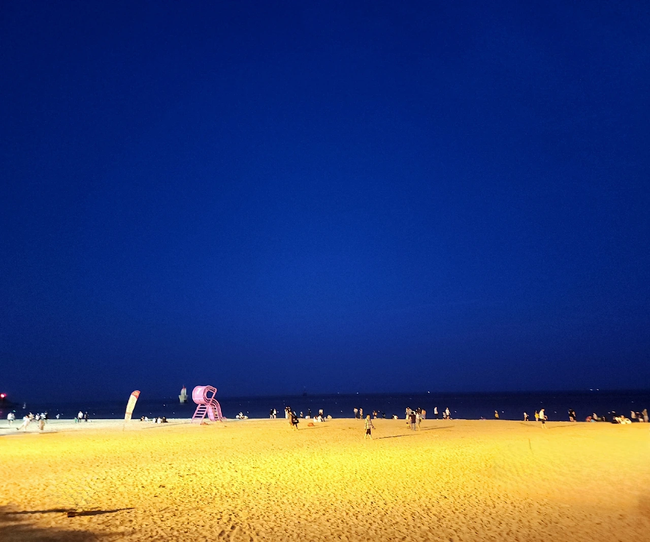갤러리투어를 끝으로 오후 일정을 마치고 자체 시에스타(스페인어로 낮잠) 시간을 가졌다. 이번엔 해운대 야시장 골목으로 가본다. 뭐 맛있는 게 있나 동네사람이라도 된 것처럼 휘적휘적 걸으며 동네를 어슬렁거린다. 아기자기한 소품가게와 횟집, 먹음직스러운 분식집을 구경하며 당기는 데로 길거리음식을 한두 개씩 사 먹으며 주전부리로 저녁을 때운다. 부른 배를 두드리며 동네골목을 돌아다니며 다다른 곳은 또다시 해운대 바닷가. 그런데 오늘 하늘색이 너무 깊다. 이 색을 뭐라고 부르면 좋을까.