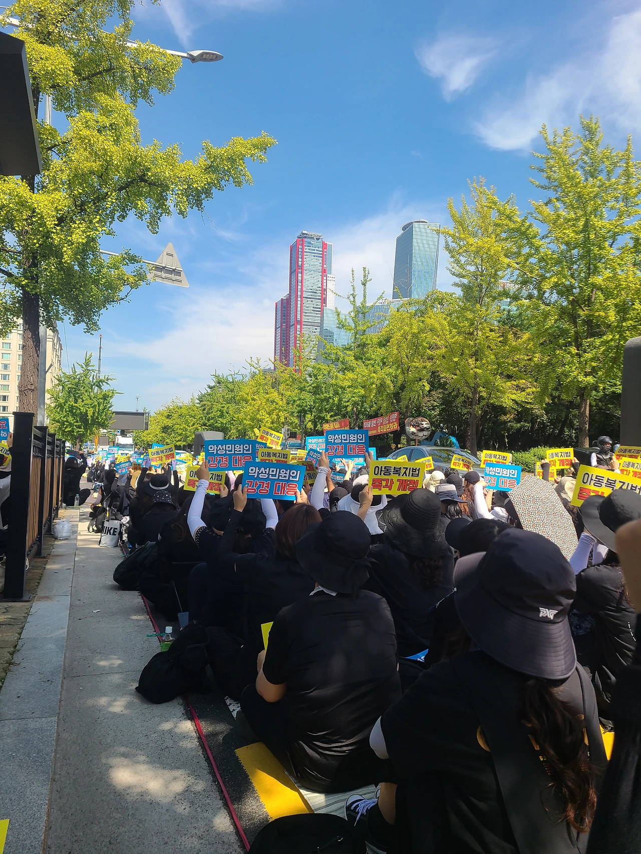 아직 여름의 열기가 가시지 않은 9월 초, 작열하는 햇빛 속에 20만 명 이상의 교사가 모였다. 엄청난 인파 사이로 대형버스가 수십 명의 사람들을 쏟아내고 사라지고를 반복한다. 2시를 알리는 소리와 함께 집회가 시작된다. 먼저, 돌아가신 분들을 위로하는 묵념을 하자는 목소리에 모두 동시에 눈을 감는다. 순간, 극단적인 선택하고 만 풋풋하고 어린 교사의 고뇌에 찬 모습이 보인다. 쓸쓸하게 혼자 남겨진 서늘한 교실도 눈앞에 펼쳐진다. 이내 눈물이 뚝뚝 떨어진다. 여기저기 이름 모를 선생님들의 낮은 흐느낌도 같이 전해진다. 이런 느낌을 이심전심이라고 해야 할까.