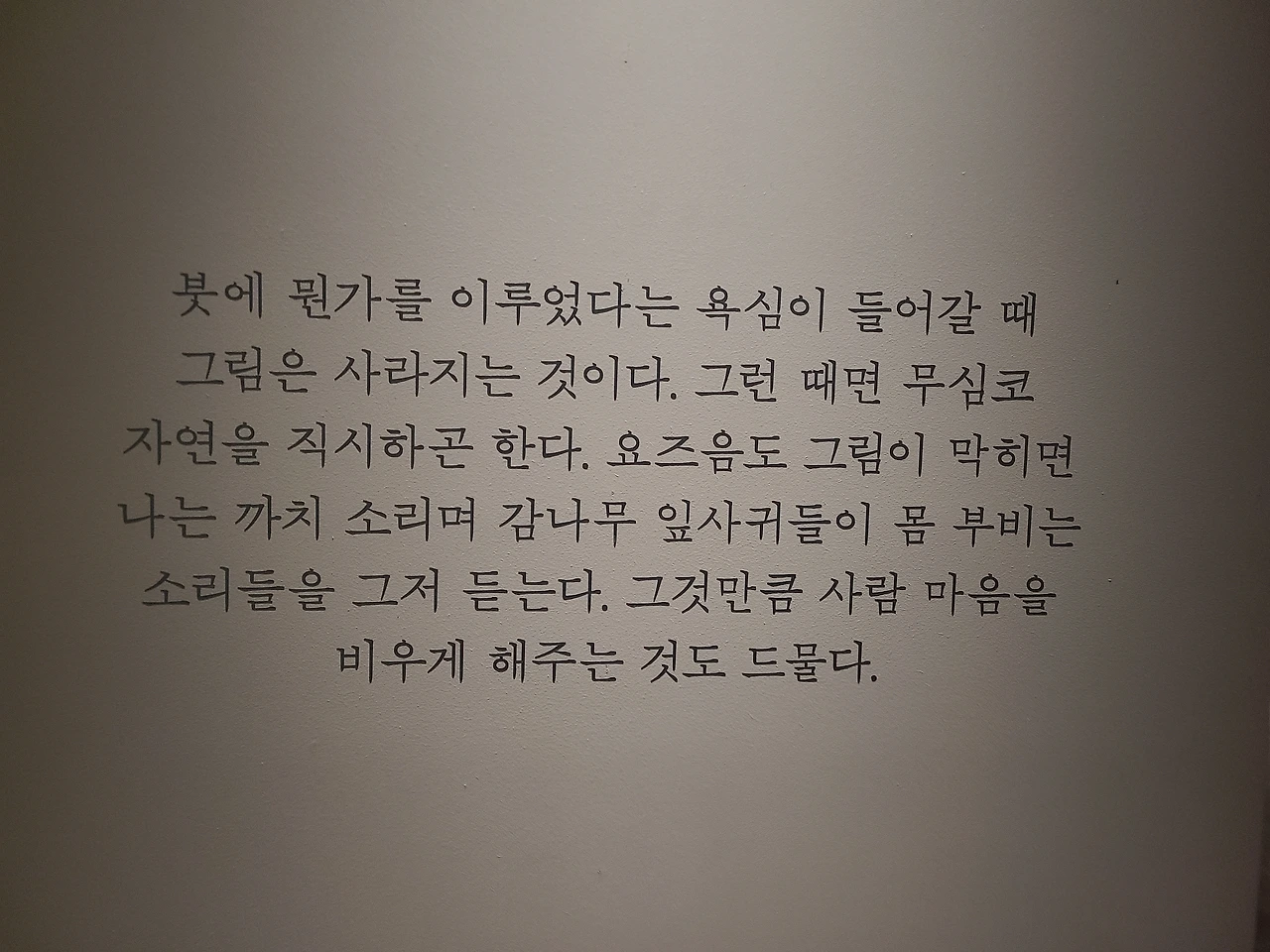 붓에 뭔가를 이루었다는 욕심이 들어갈 때 그림은 사라지는 것이다. 그런 때면 무심코 자연을 직시하곤 한다. 요즘도 그림이 막히면 나는 까치 소리며 감나무 잎사귀들이 몸 부비는 소리들을 그저 듣는다. 그것만큼 사람 마음을 비우게 해주는 것도 드물다.