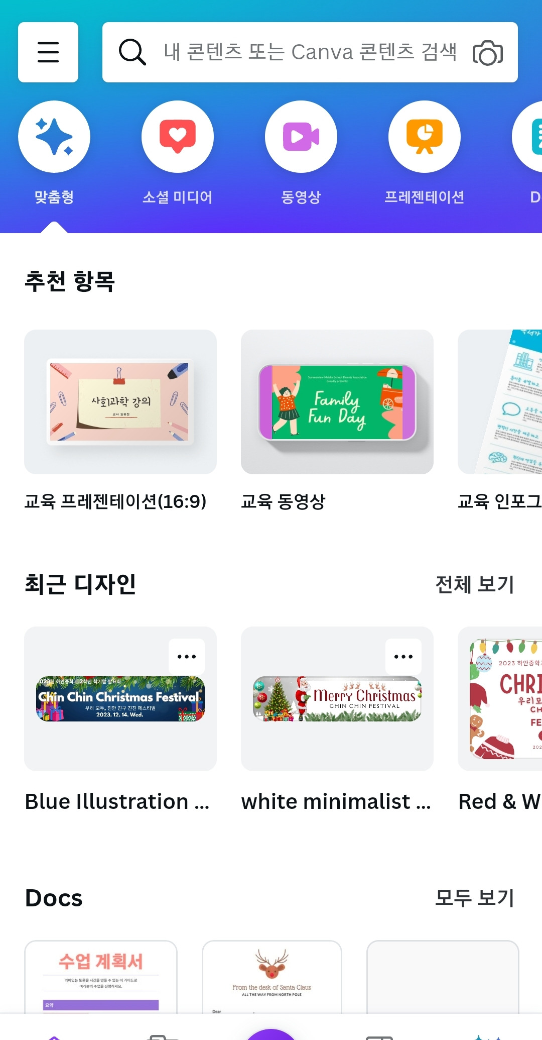'Canva', 에듀테크 연수 때 주워 들었던 앱을 클릭해 실행해 본다. 교사인증을 받으면 대부분의 자료를 무료로 이용할 수 있다.