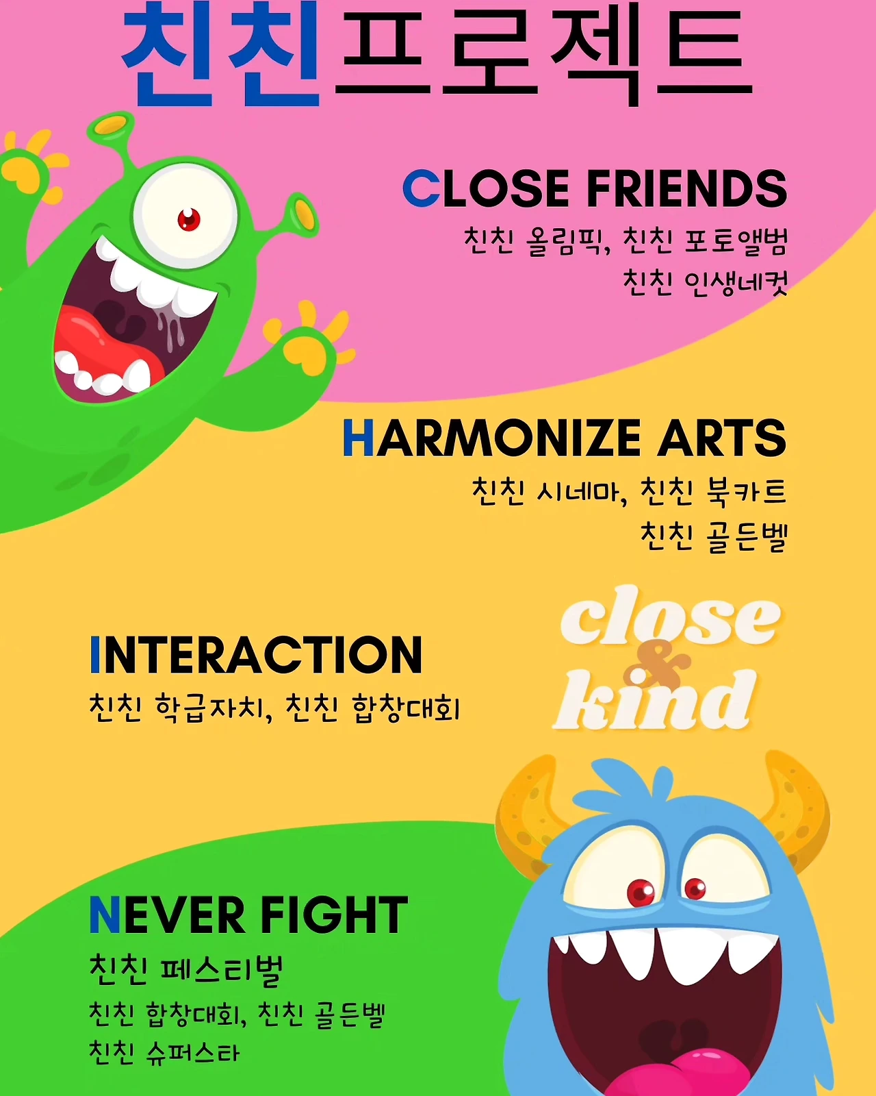 친친 시네마 : 일주일에 한번, 점심 먹고 나른한 오후에는 친구들이 추천한 우정에 관한 영화를 본다. 삼삼오오 모여 영화도 보고 다 보고 나서는 소감문 대신에 영화내용에 대해 간단한 퀴즈를 작성해 본다. 친구들이 적은 퀴즈를 뽑아 마지막 페스티벨의 '친친 골든벨' 행사로 연결한다.