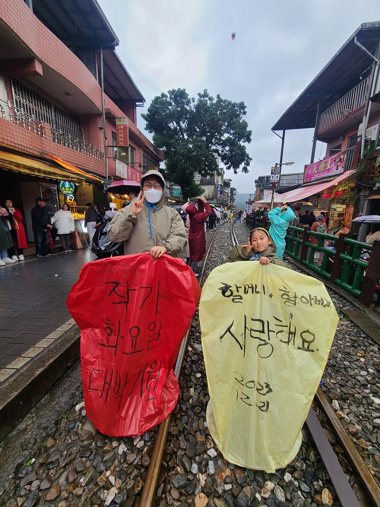 가이드의 안내대로 버스에 내리자마자 지체 없이 풍등이 준비된 상점으로 빠르게 걸어간다. 커다란 풍등이 쓰기 좋게 집게에 펼쳐져 있다. 풍등의 4면에 각자의 소원을 적고 철길 위로 나간다. 순서를 기다리면 직원들이 우리에게 딱 맞는 포즈를 요구하고 능수능란하게 사진을 찍는다 . 우린 시키는 데로 고분고분 따라한다. 거의 공장에 가까운 자동화 시스템이다. 빠르게 움직이며 풍등을 날리고 미션완료! 그런데 어라~? 막내가 만든 풍등의 방향이 이상하다. 삐딱하게 날아가더니 근처 나무에 걸려 타고 있는 것이다. 마침 비가 내리고 있던 터라 화재의 위험은 없었지만 막내는 금방 시무룩해진다. 속상한 마음을 알았는지 직원이 작은 풍등 액세서리를 건네준다. 어느새 아이의 얼굴이 환해진다. 순수한 아이의 마음처럼 힘든 일, 속상한 일은 금방 사라지고 풍등에 날린 소원이 모두 이루어졌으면 좋겠다.