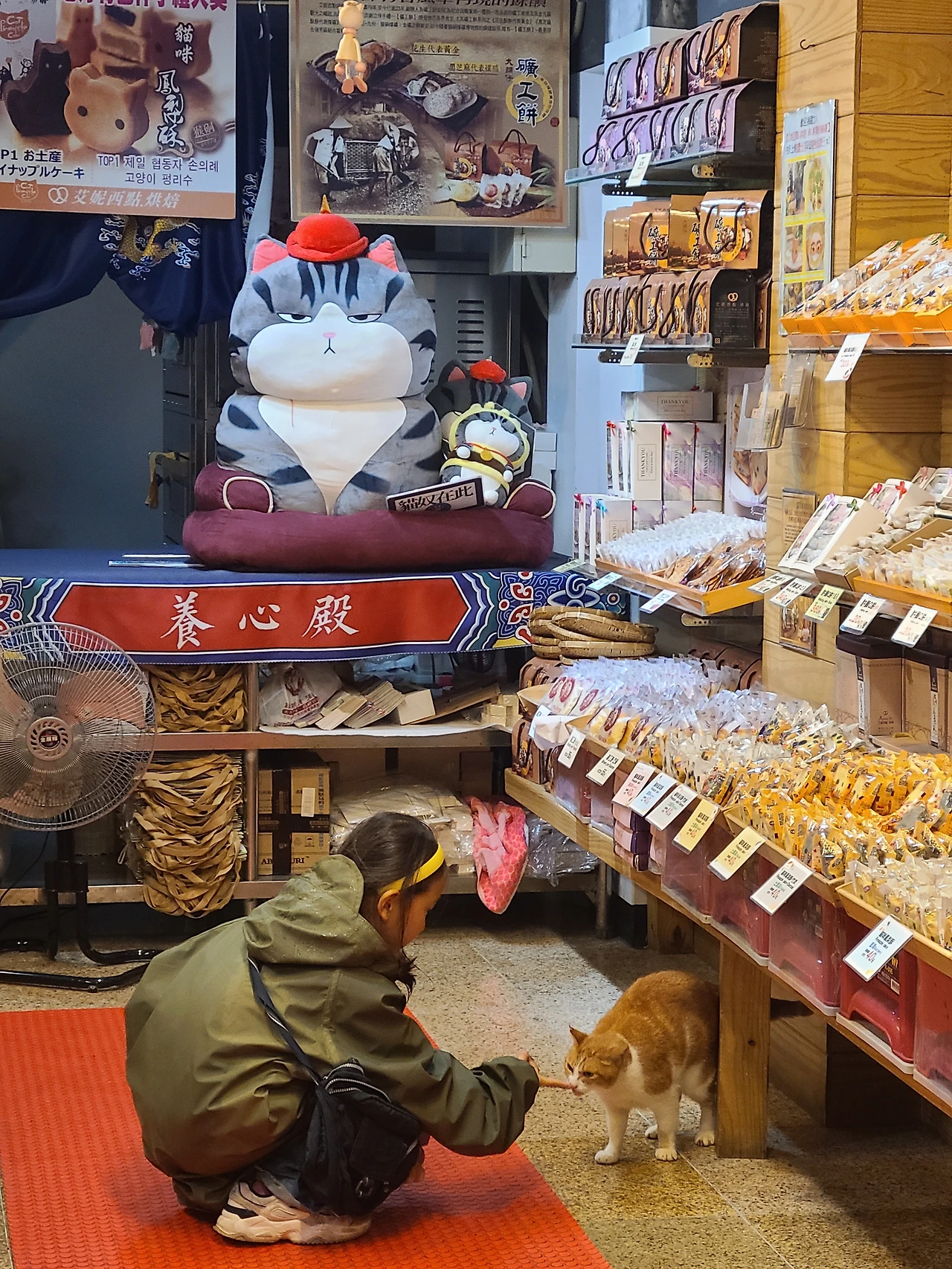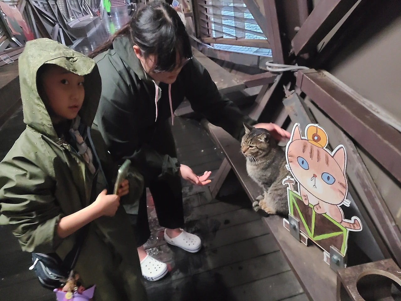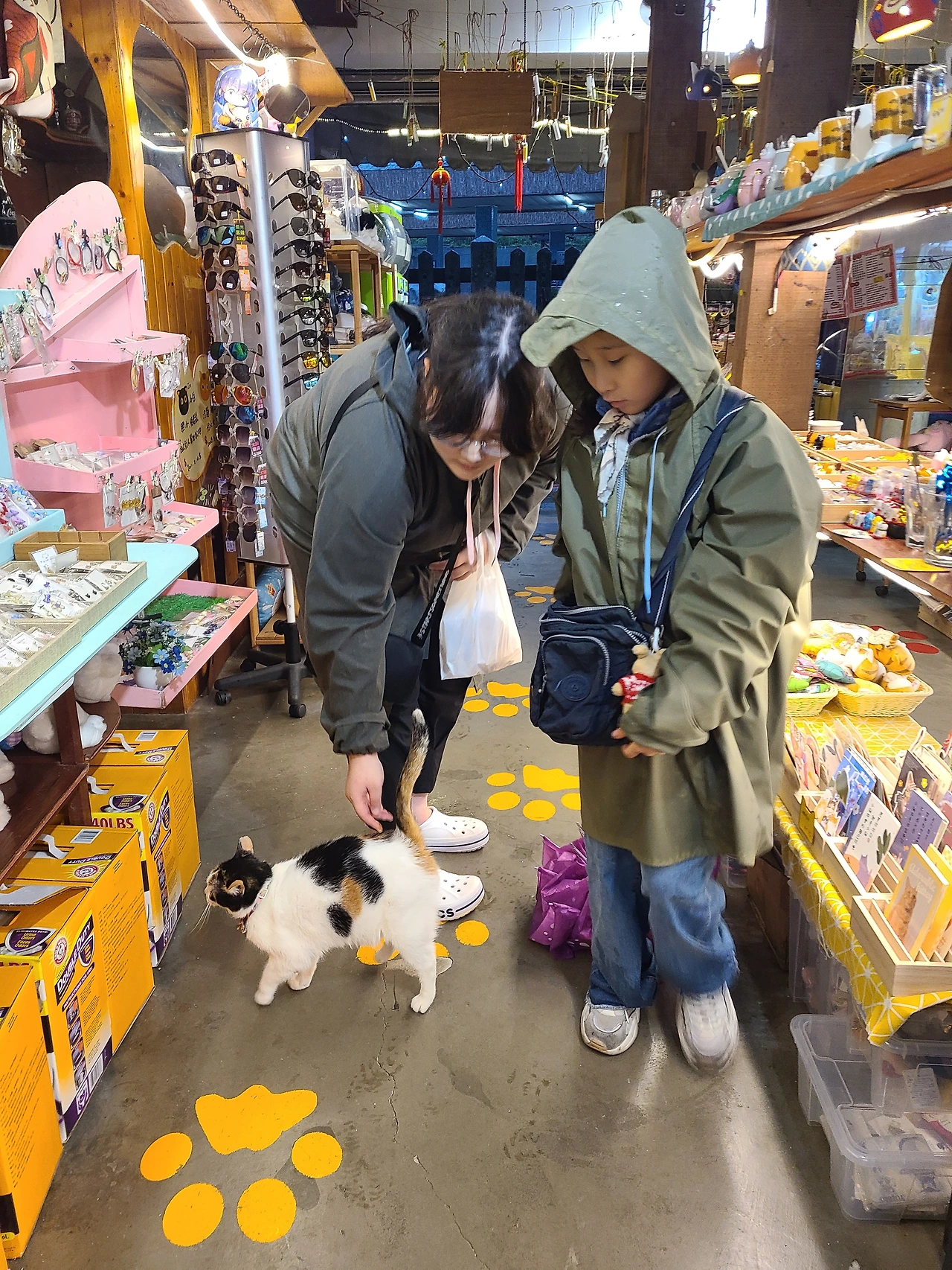 저 멀리 고양이가 보인다. 살금살금 다가가 말을 걸어본다. 조용히 찾아보면 상점이며 골목 구석구석에 숨어있는 고양이 집사들을 발견할 수 있다. 우리 집 딸들은 양이님들이 도망갈세라 잔뜩 몸을 수그리고 조심조심 다가간다. 소녀들은 냥이들에게 마음을 빼앗겨 비 오는 날도 아랑곳하지 않고 열심히 접선할 뿐이다.