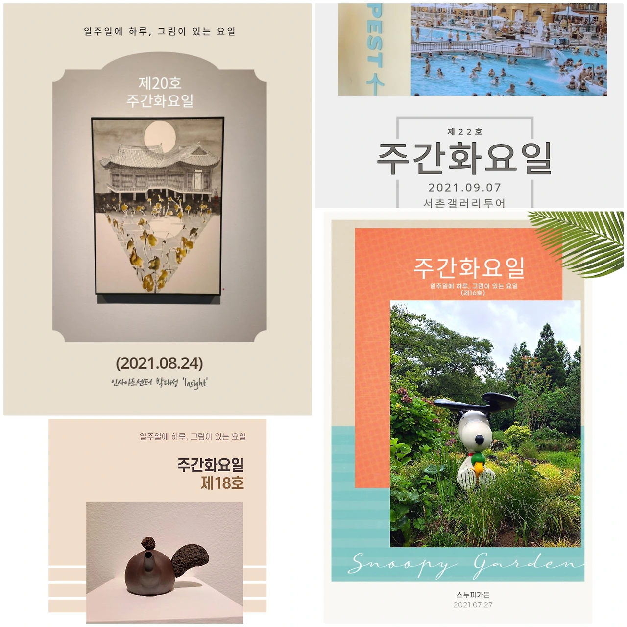 10주간의 수업은 끝났다. 글쓰기는 멈추지 않는다. 나에겐 다 계획이 있다. 일 년 동안 미술관을 매주 한 곳씩 가기로 한 것. <방구석 미술관 2>를 읽고 책 속 화가의 작품을 보러 제주도고 부산이고 광주고 일정과 시간이 맞는 다면 달려갔다. 때론 가족과 때론 친구와. 혼자 갈 때도 있지만 차 한잔과 그림이 있으니 감상과 느낌을 정리하기에는 딱 좋았다. 매주 그림과 글이 있는 내 멋대로 잡지 <주간 화요일>을 블로그에 발행했다. 보고 들은 것을 매주 한 번씩 나만의 감상과 연결하여 에세이로 적고 기록한다. 조회수가 올라가고 댓글이 달리고 '좋아요'스티커를 보며 뿌듯하고 소소한 재미를 느낀다.