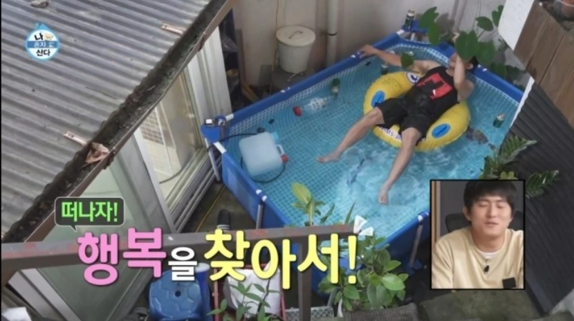 요리를 하고 맛있게 먹기 위한 준비를 하는 과정이었다. 야외에서 버너에 큰 양푼냄비에 닭과 사온 재료, 약수를 넣고 끓이기 시작한다. 여기까진 평범했다. 그러더니 작은 마당 창고를 뒤져서 잘 보관해 두었던 비밀 장비를 꺼낸다. 무엇일까 호기심에 가만히 살펴본다. 가정용 수영장 세트였다. 그는 각각의 분리된 뼈대를 능수능란하게 조립하고 방수천을 펴서 연결하더니 어느새 근사한 수영장을 완성한다. 이 정도면 '와, 신박하다'하고 신기해할 정도인데, 갈수록 점입가경이다. 그는 물을 기르고 나르고 하더니 성에 안 찼는지 새로운 방식으로 세탁기 수도에 호스를 연결해서 힘겹게 물을 채우기 시작한다. 수압이 어느 정도 세지고 물이 잘 채워지자, 갑자기 주방에 들어가 시장에서 사 온 신선한 과일을 씹어 내오고 막걸리, 소주 등을 물에 담근다. 스노클링 장비와 튜브까지 꺼내와서 한 참을 준비하고 세팅하더니 드디어 입수. 튜브에 누워 편안하게 즐기는 그의 모습이 기가 막힌다. '아, 이렇게 즐길 수 있구나!'