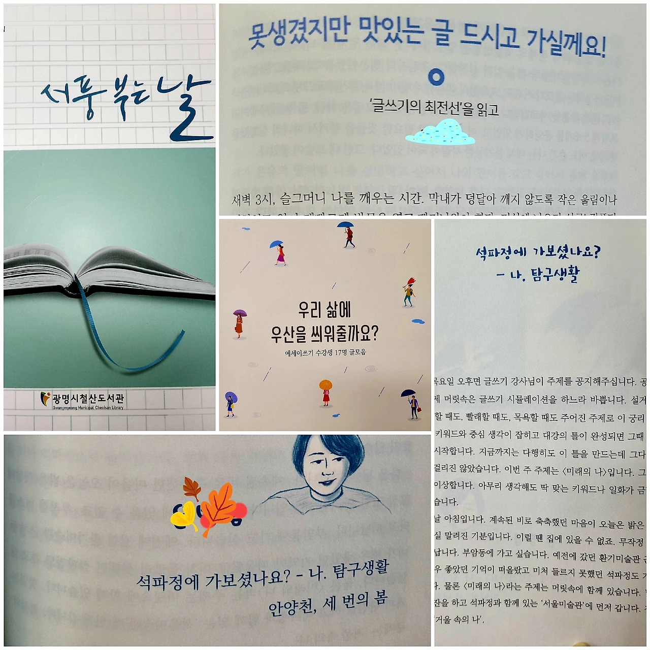 행여나 십 년, 이십 년이 지나서 다시 보게 되면 부족하고 창피한 글일 수도 있겠지만 작은 시도의 발자국, 열심히 고민한 흔적은 누렇게 바랜 일기장만큼이나 소중한 나름의 역사이지 않을까. 잔뜩 받아둔 문집을 쌓아두고 누구에게 줄까. 요즘 같은 때에 베스트셀러도 아닌 조촐한 문집을 챙겨주면 누가 좋아할까. 부담이 되지 않을까 괜한 걱정을 한다. 혹시나 재활용 쓰레기 종이로 분리배출될 위기에 처해질까 봐 선뜻 내주지도 못하고. 내 방구석에 똑같은 문집 몇권이 언젠가 읽힐 그날을 기다리며 올망졸망 쪼르르 꽂혀있다.