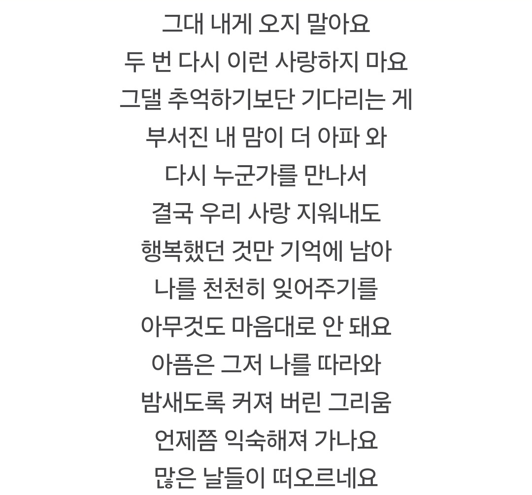 아쉬운 마음이가득해져, 문득 이 노래가 떠오른다. 지난 일 년 동안의 일들이 스치면서 하루에도 몇 번씩 이 노래를 듣고 또 듣는다. 이다지도 촌스러운 나. 송별회에 이 노래를 불러줘야겠다고 나 혼자 다짐한다. 누기 시키지도 않았는데 말이다.감정이 차올라 산책로가 무대인 양 내 멋대로 큰 소리로 노래를 부르는데도 아들은 여전히 아무 말이 없다.