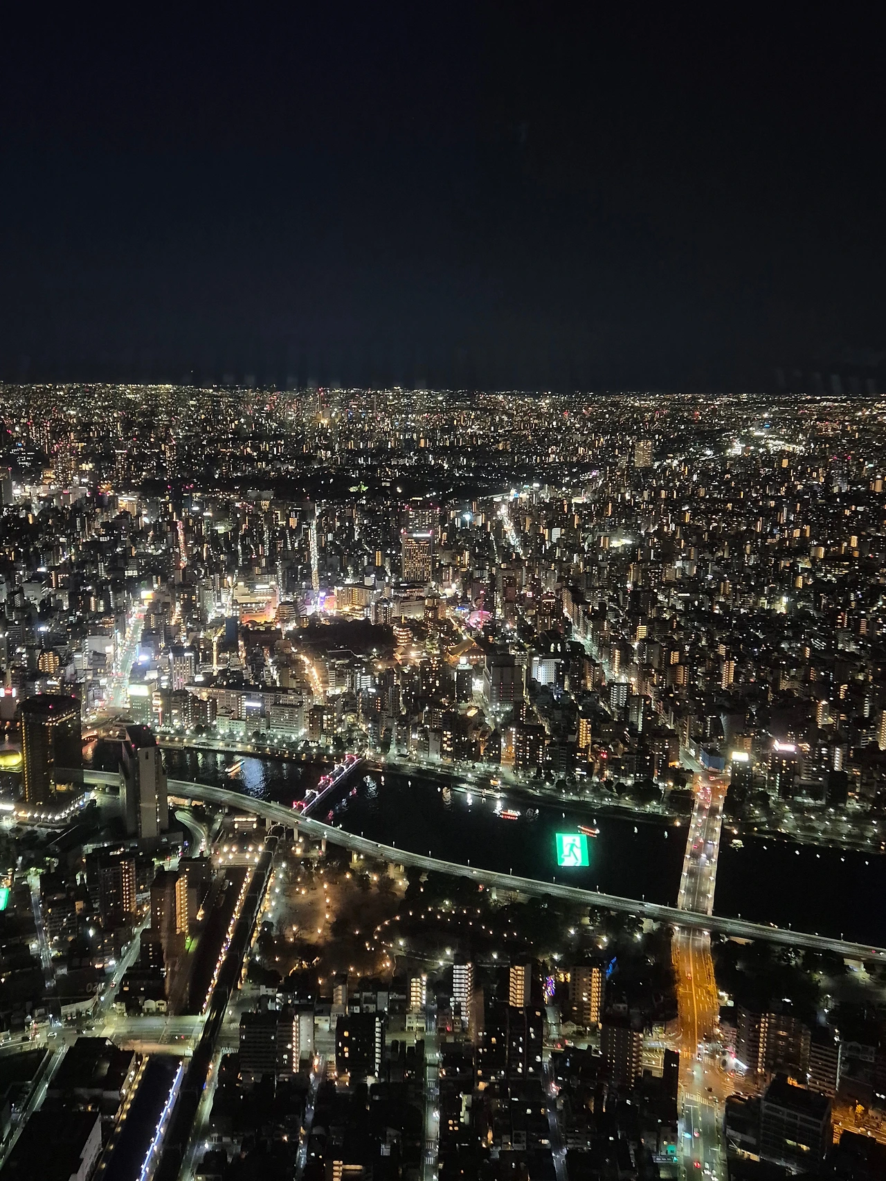 맛있게 저녁을 먹고 스카이트리 앞에서 다른 일행들을 다시 만났다. 초고속으로 오르내리는 엘리베이터를 타고 전망대에 도착하니 불빛으로 만들어낸 멋진 야경이 눈에 들어온다. 자로 자른 듯한 정갈한 도시의 골목과 집들, 또 정확하게 반짝이는 불빛이 흑백의 하늘과 대비되어 더욱 환하다. 사방이 유리로 만들어진 전망대를 360도로 돌아보며 멋진 야경에 취해본다. 감상에 젖어들어갈 찰나, 힘들다며 슈퍼베이비, 큰 아들이 슬슬 짜증을 보이기 시작한다. 나도 급 피로감이 몰려와 부리나케 택시를 잡아타고 곧장 숙소로 간다. 이렇게 도쿄에서의 단 하루.
