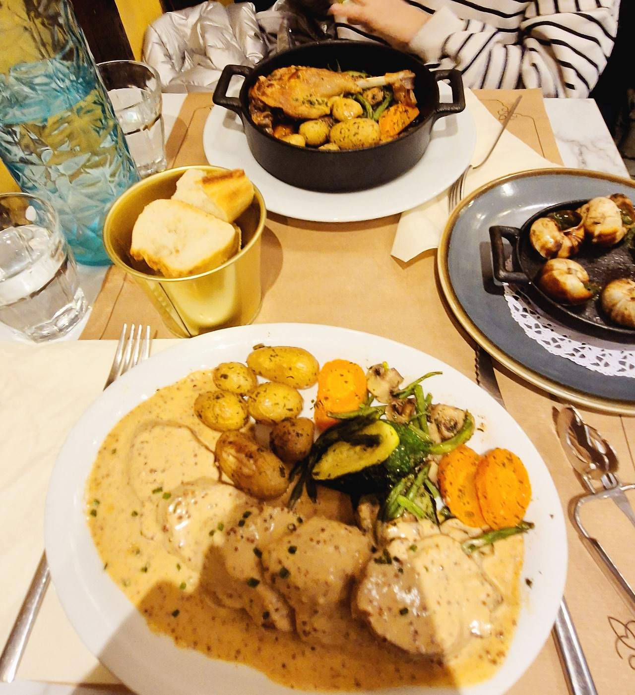 크로와상과 바게트는 식당엘 가면 늘 있는 것이라 그 맛과 식감에 익숙해졌다. 크로와상은 겉바속쫄: 겉은 바싹하고 속은 쫄깃하다. 바케트는 우리나라 것보다 더 담백하다. 파리음식하면 누구나 에스까르고를 말한다. 나는 찾아먹고 싶을 정도는 아니었으나 파리가 난생처음인 막내딸은 먹어봐야 할 것 같아서 데이투어 한국인 가이드가 추천해 준 맛집을 찾아갔다. 무려 30~40분의 대기를 하고 맛본 그럴듯한 프랑스 요리.